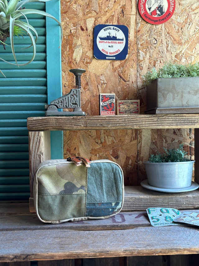 [RZ240033] ユーズドミリタリーテントをリメイクしたポーチです。 ✔︎zipを全開にしても中身がこぼれない ✔︎全開にしたまま自立できて中身が取り出しやすい ✔︎文庫本サイズなのに沢山入る ✔︎中にも仕切りポケットが4つ ✔︎patchが全て違ってどれも世界に一つだけ 使いやすさにこだわった、自信を持ってお勧めのポーチです! 表も裏も全て違うパッチで同じ物は2つとありません。 これ!と思ったら早めにgetしてくださいね! ミリタリーテントのディテールを生かしたオンリーワンのデザインとなっており、ボタンホールやハトメ、テントの耳をそのままに使っている為、ほつれや破れが入る場合があります。 また、リメイクの性質上もとの製品を一度分解してから再構築しているため、 もとの糸をほどいたミシン目がそのまま残り、表に出ている場合がございます。 予めご了承ください。 ラウンドファスナーポーチは全ての商品で 高さ、横幅、マチ、紐の長さ、ポケットのサイズを 同一パターンにて製作しております。 [サイズ] ※サイズは全て実寸です。デザインにより多少の誤差がありますことを予めご了承ください。 本体 横幅 約18cm 高さ 約12.5cm マチ 約6cm 内ポケット(4箇所) 横 約8.5cm 高さ 約9.5cm