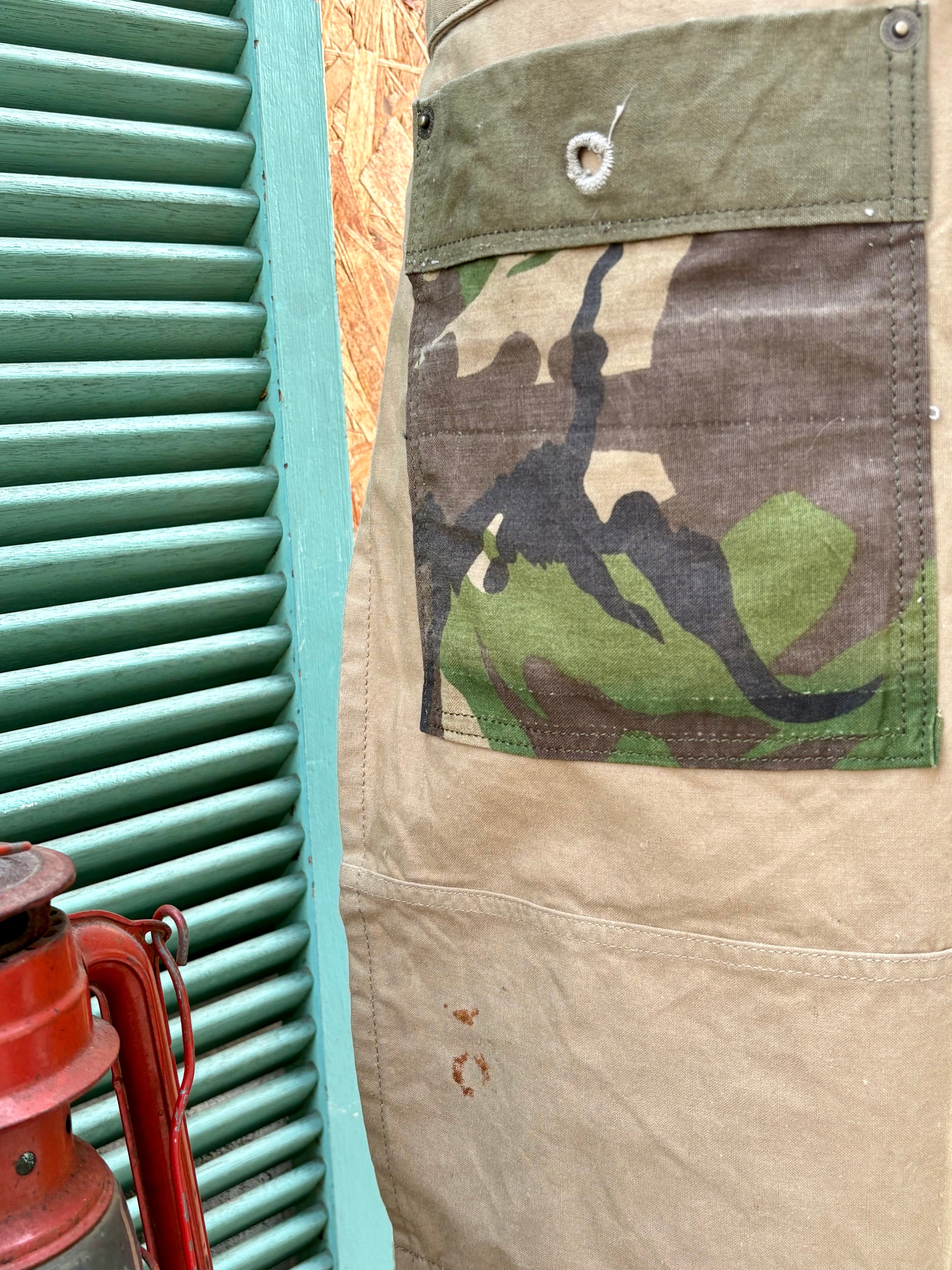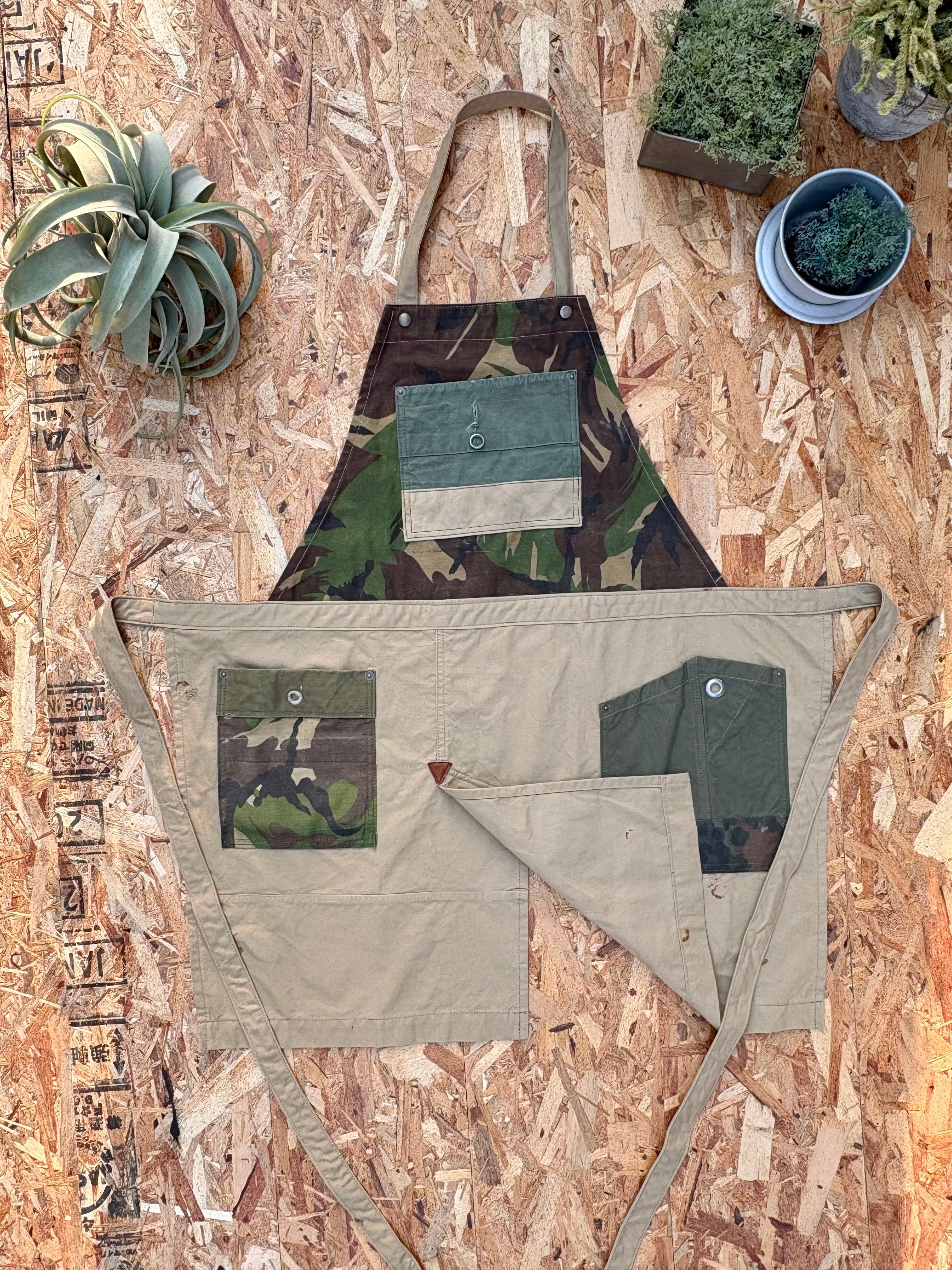 ユーズドミリタリーテントをリメイクしたワークエプロンです。ミリタリーテントのディテールを生かしたオンリーワンのデザインとなっており、ボタンホールやハトメ、テントの耳をそのままに使っている為、ほつれや破れが入る場合があります。