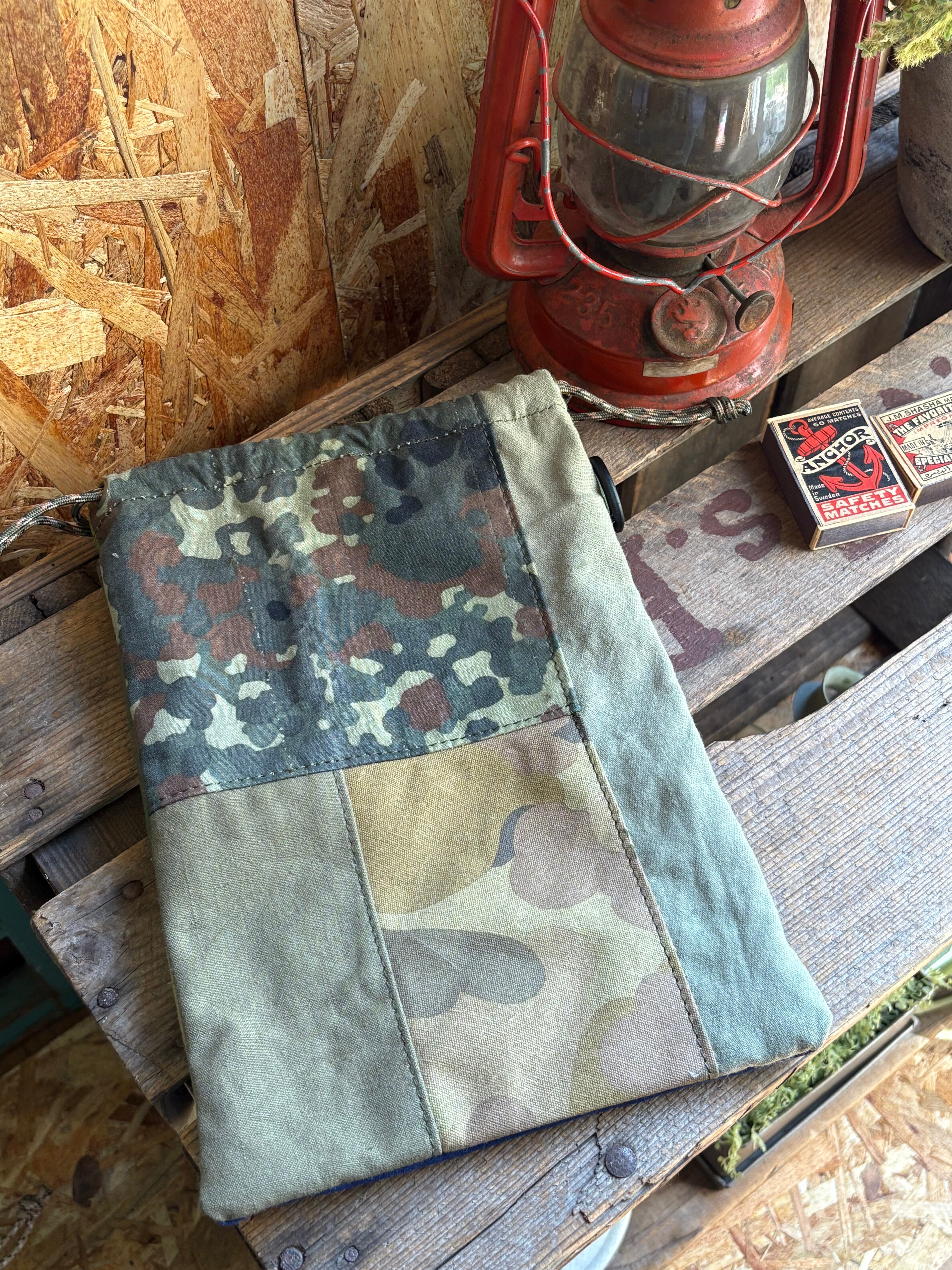 色々なミリタリーテントの端切れをパッチしたオンリーワンな巾着袋です。