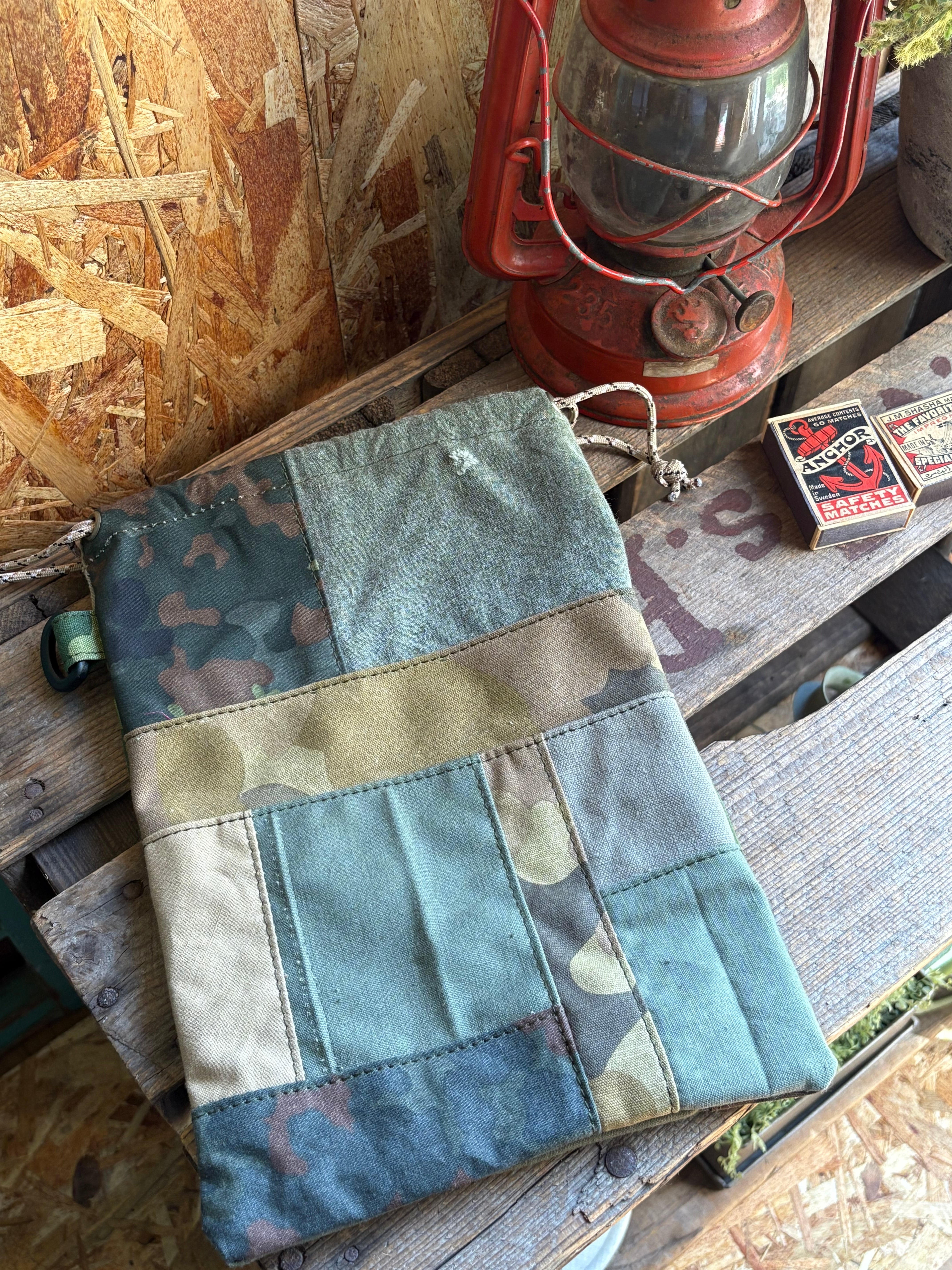 色々なミリタリーテントの端切れをパッチしたオンリーワンな巾着袋です。