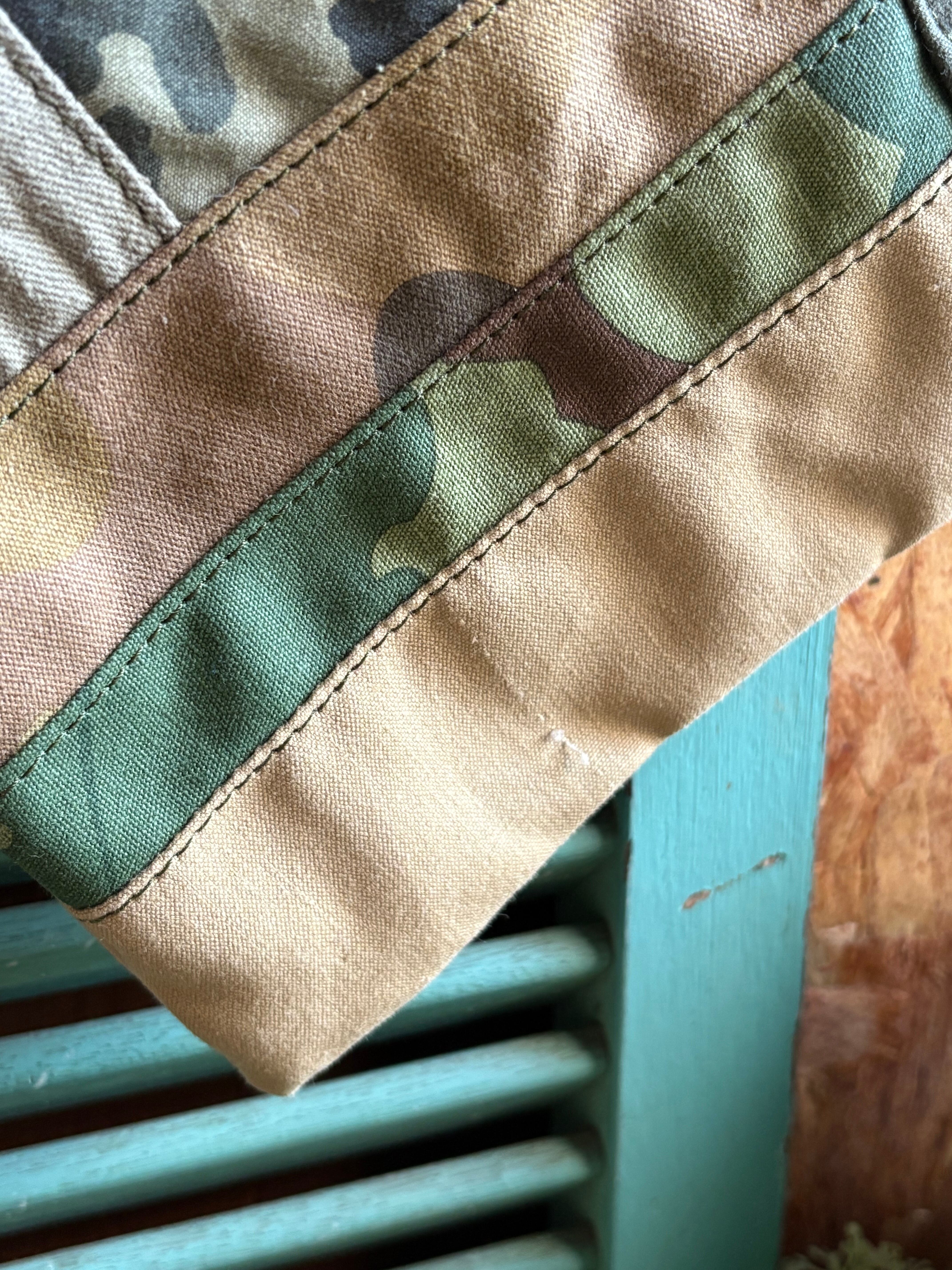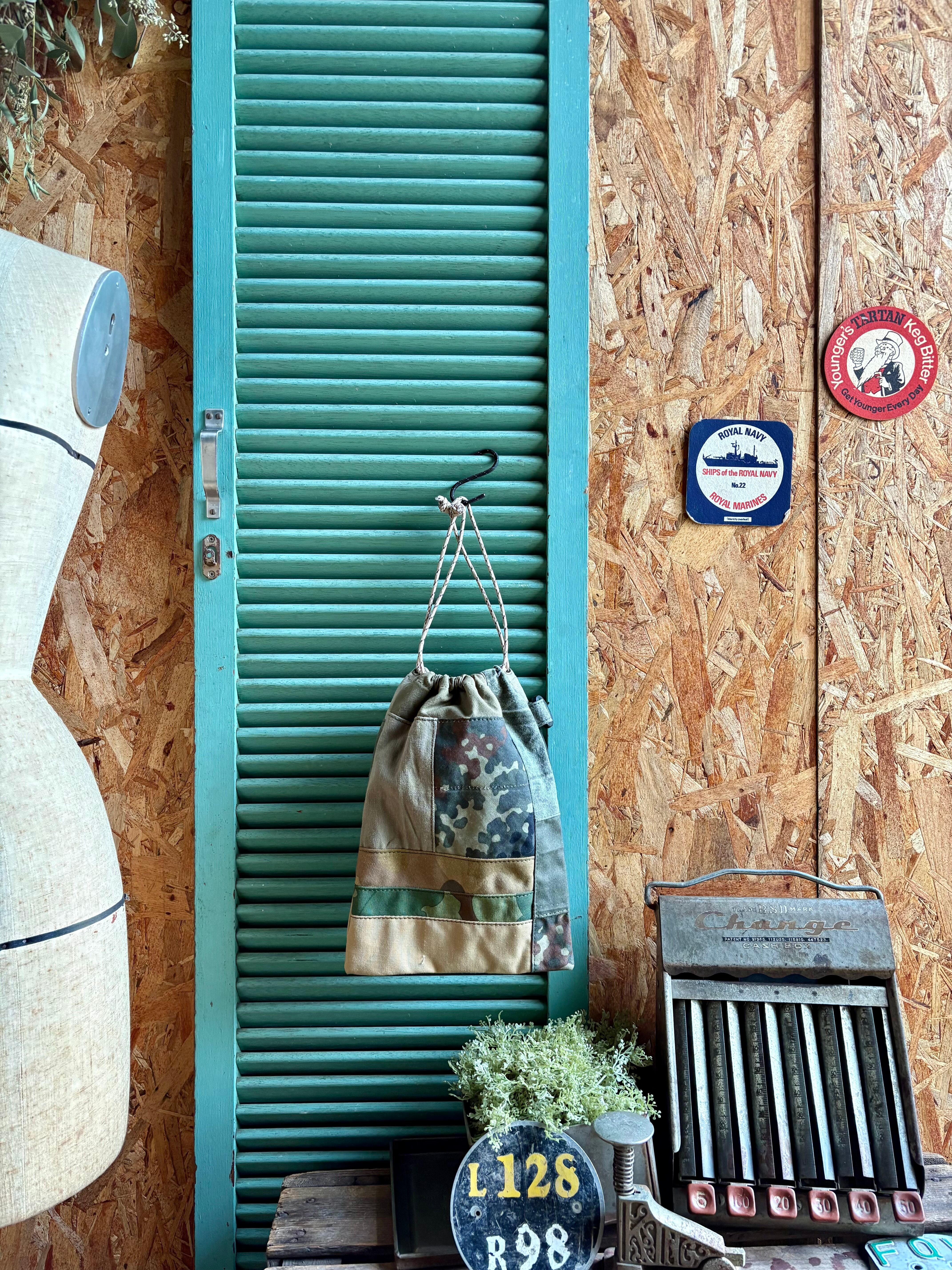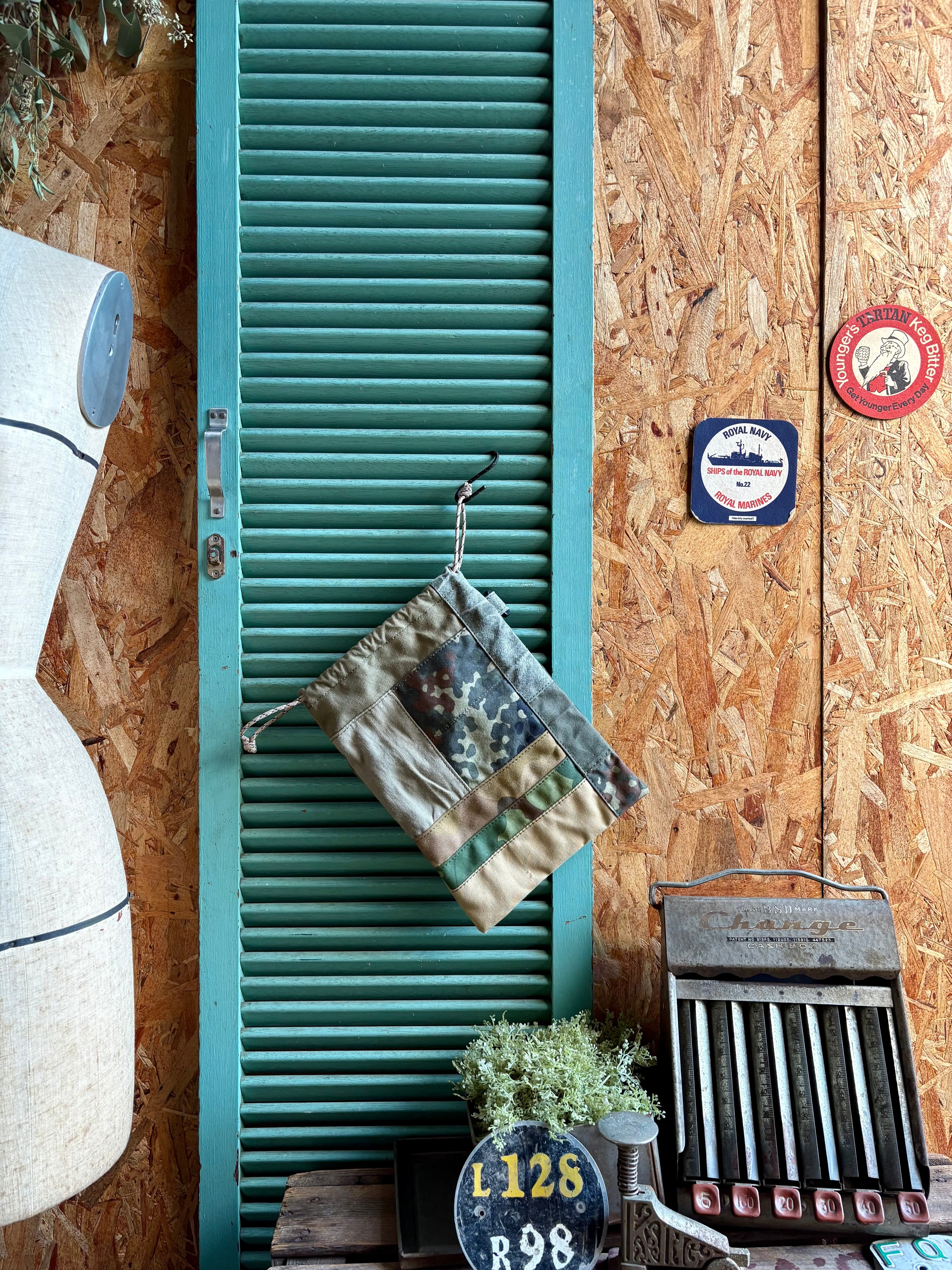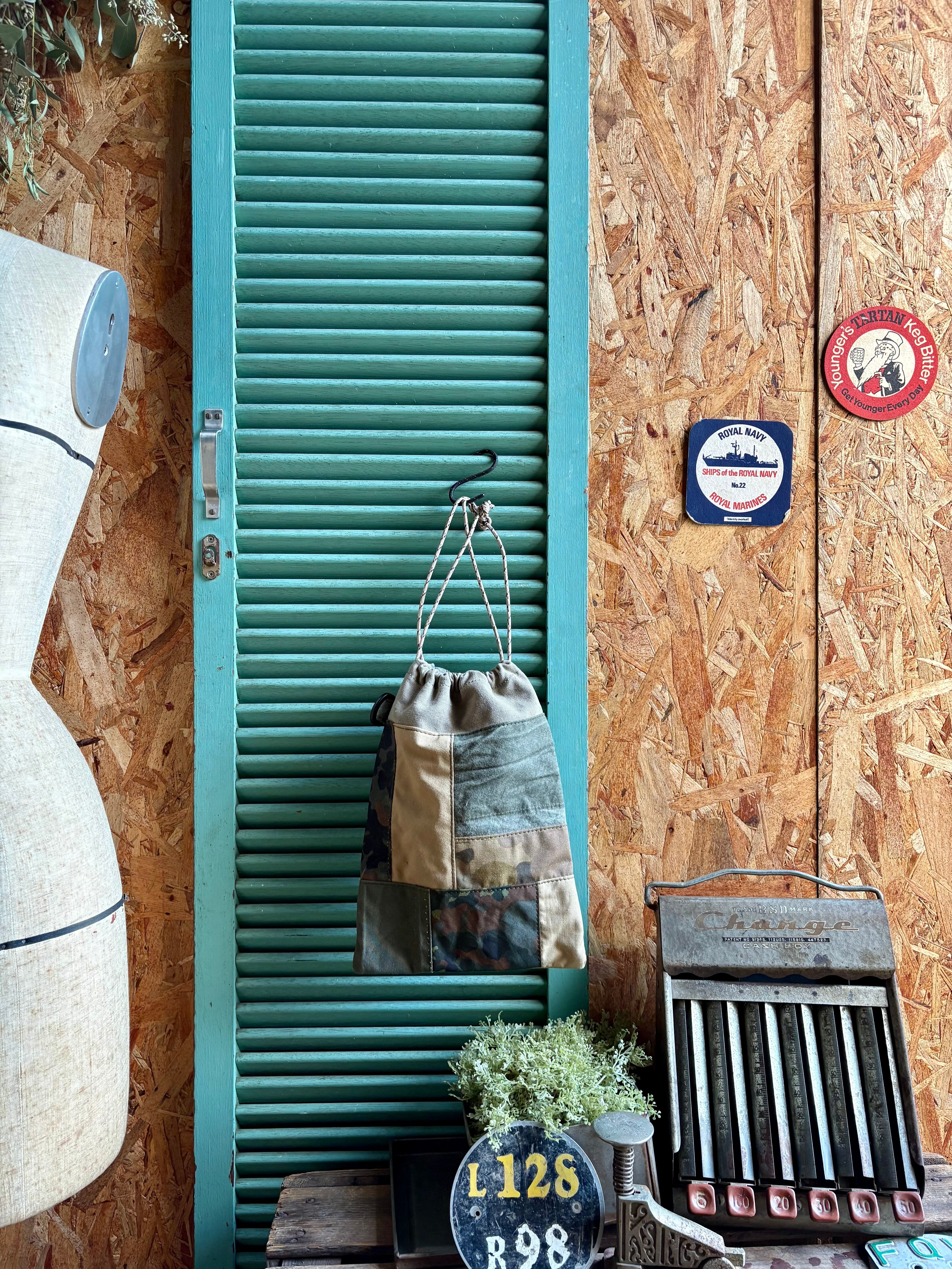 色々なミリタリーテントの端切れをパッチしたオンリーワンな巾着袋です。
