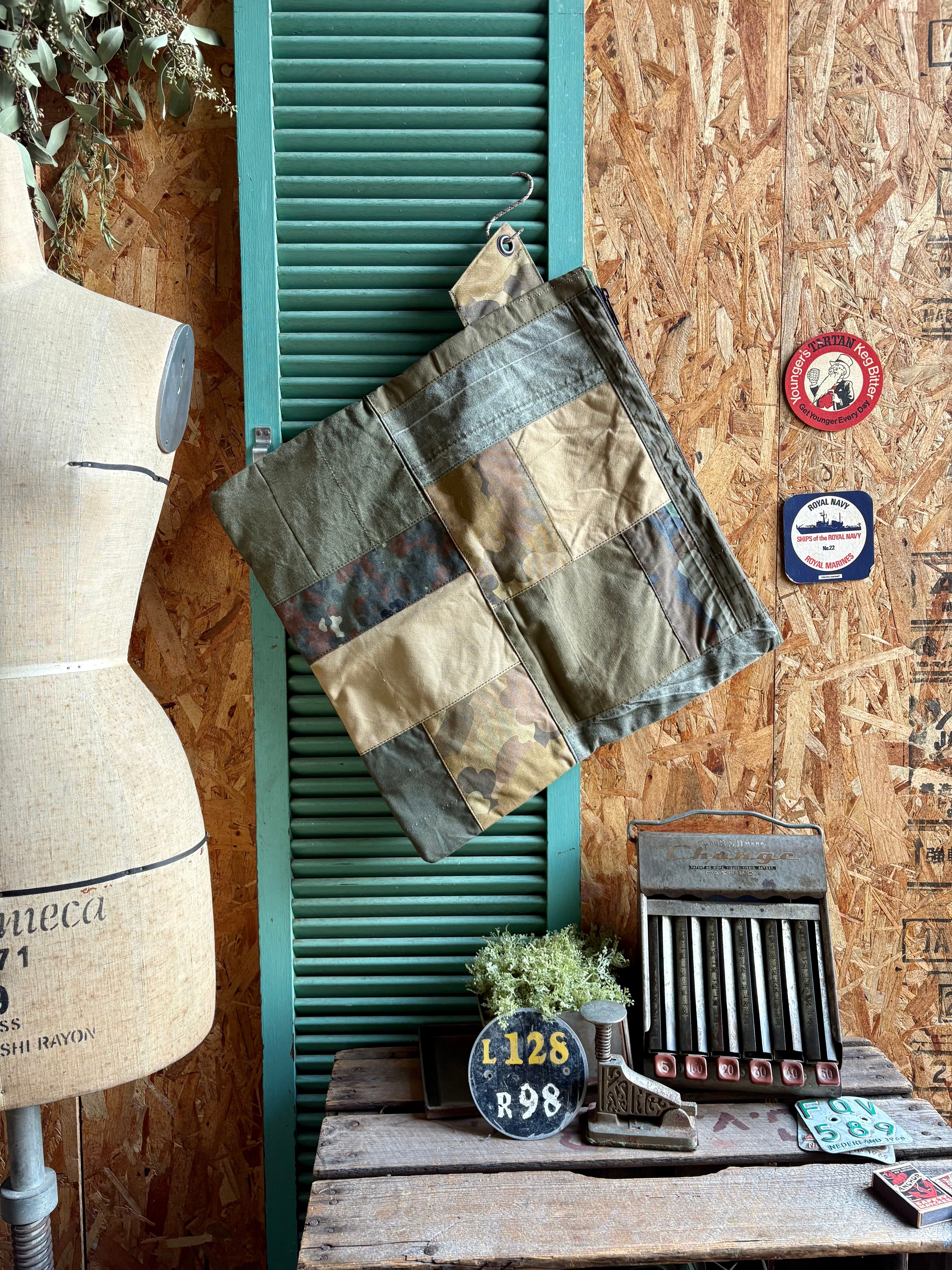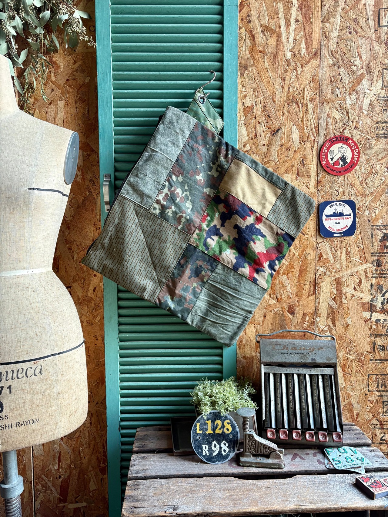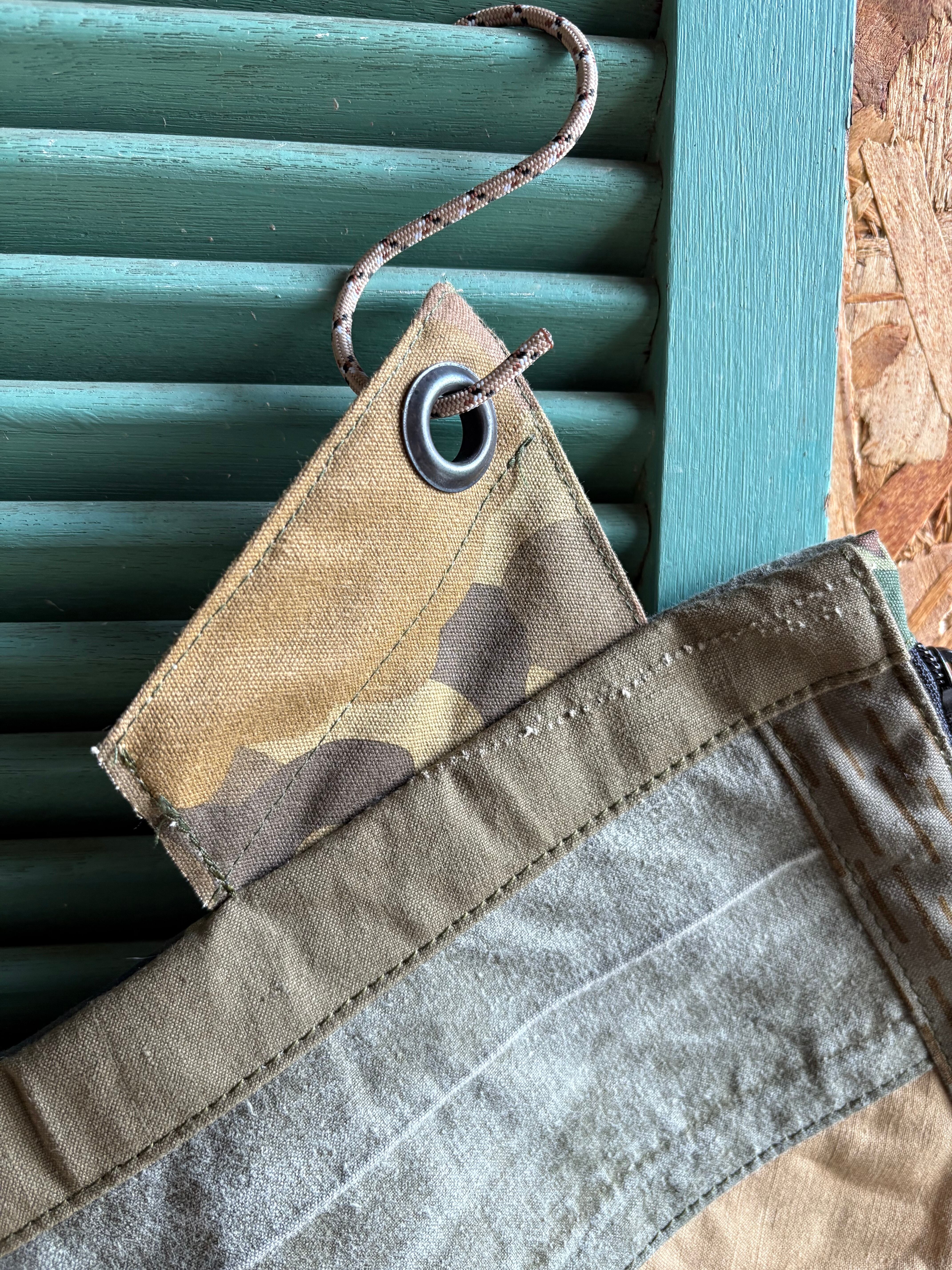 ミリタリーテントのディテールを生かしたオンリーワンのデザインとなっており、ボタンホールやハトメ、テントの耳をそのままに使っている為、ほつれや破れが入る場合があります。