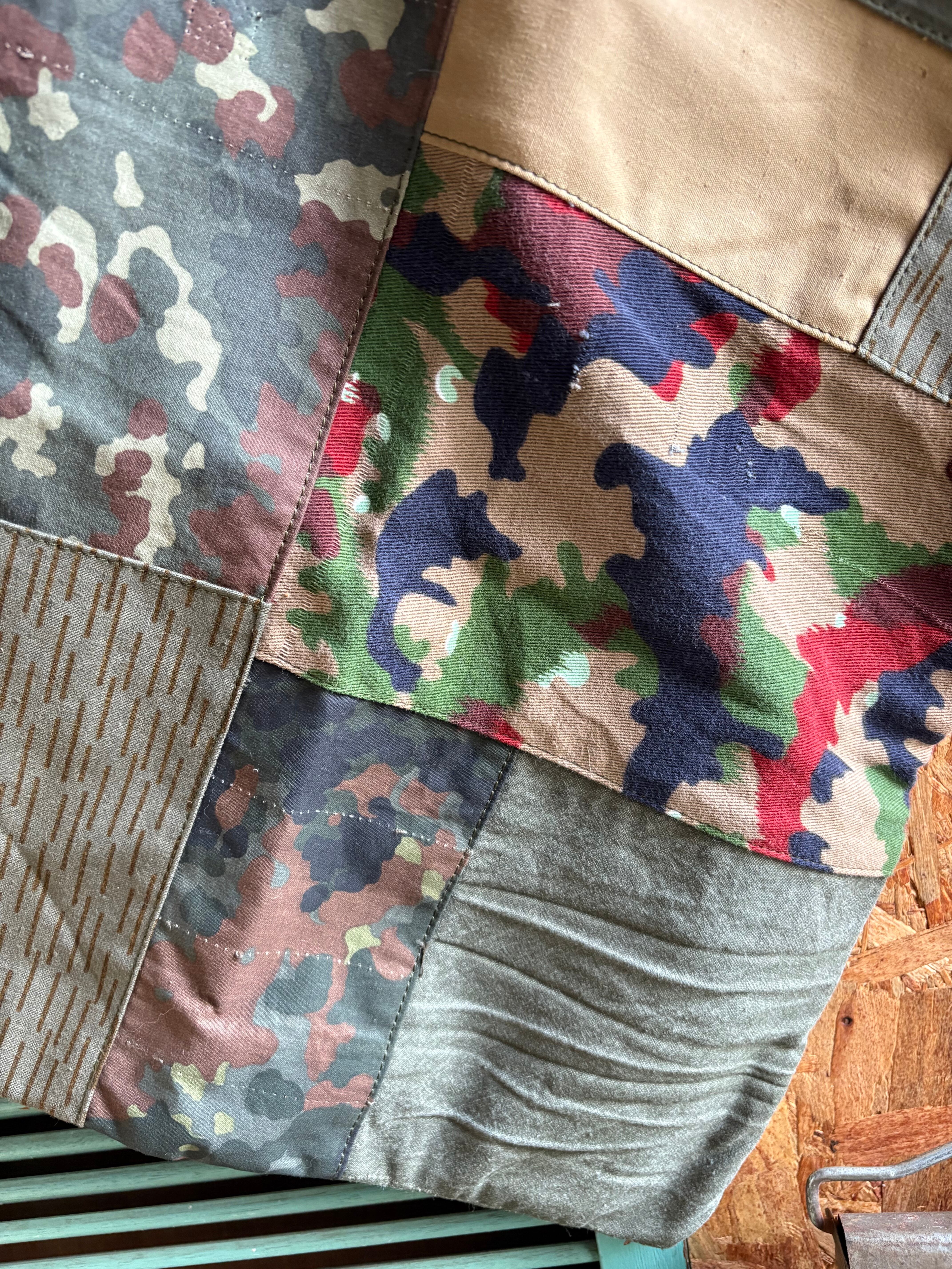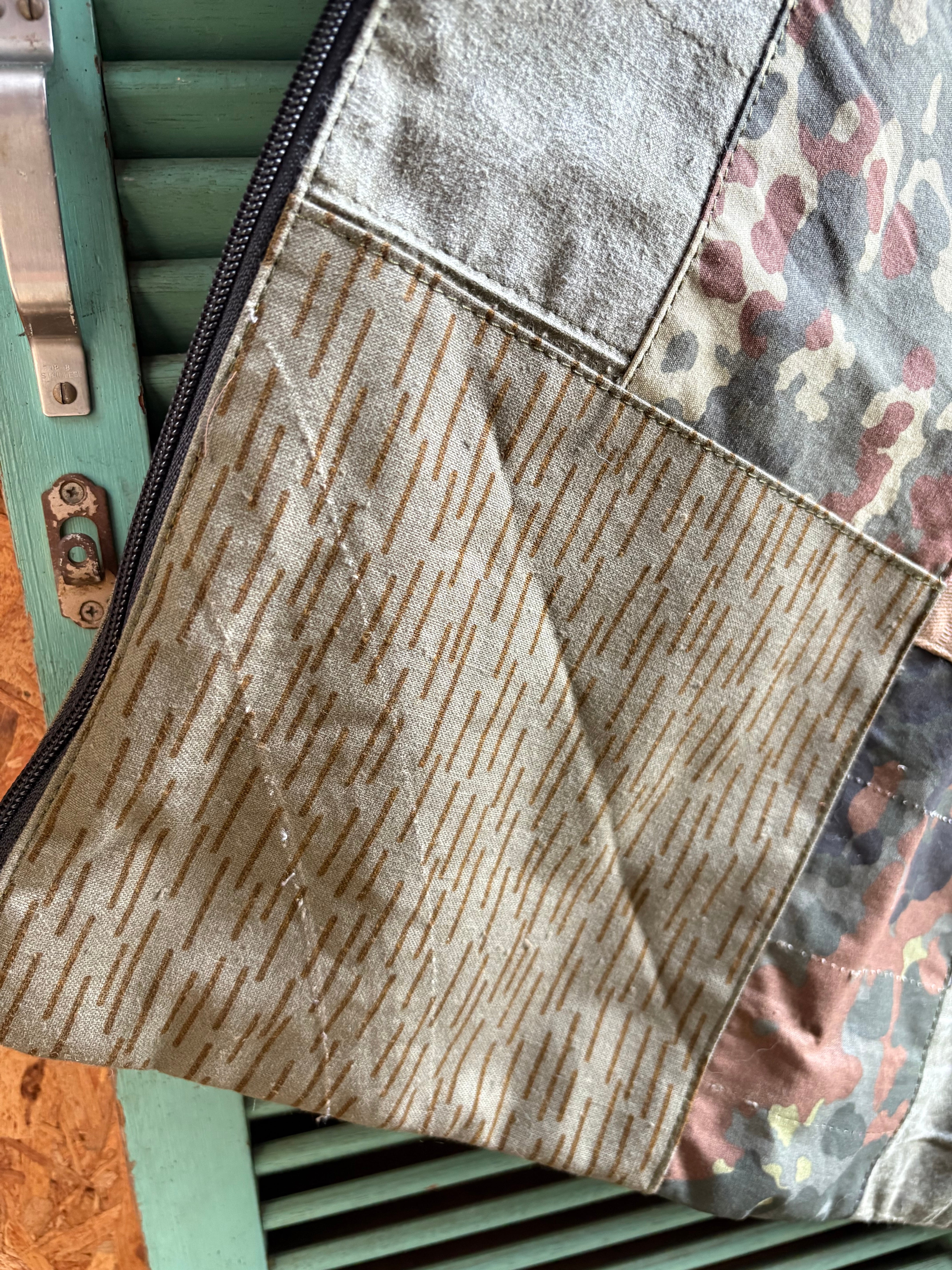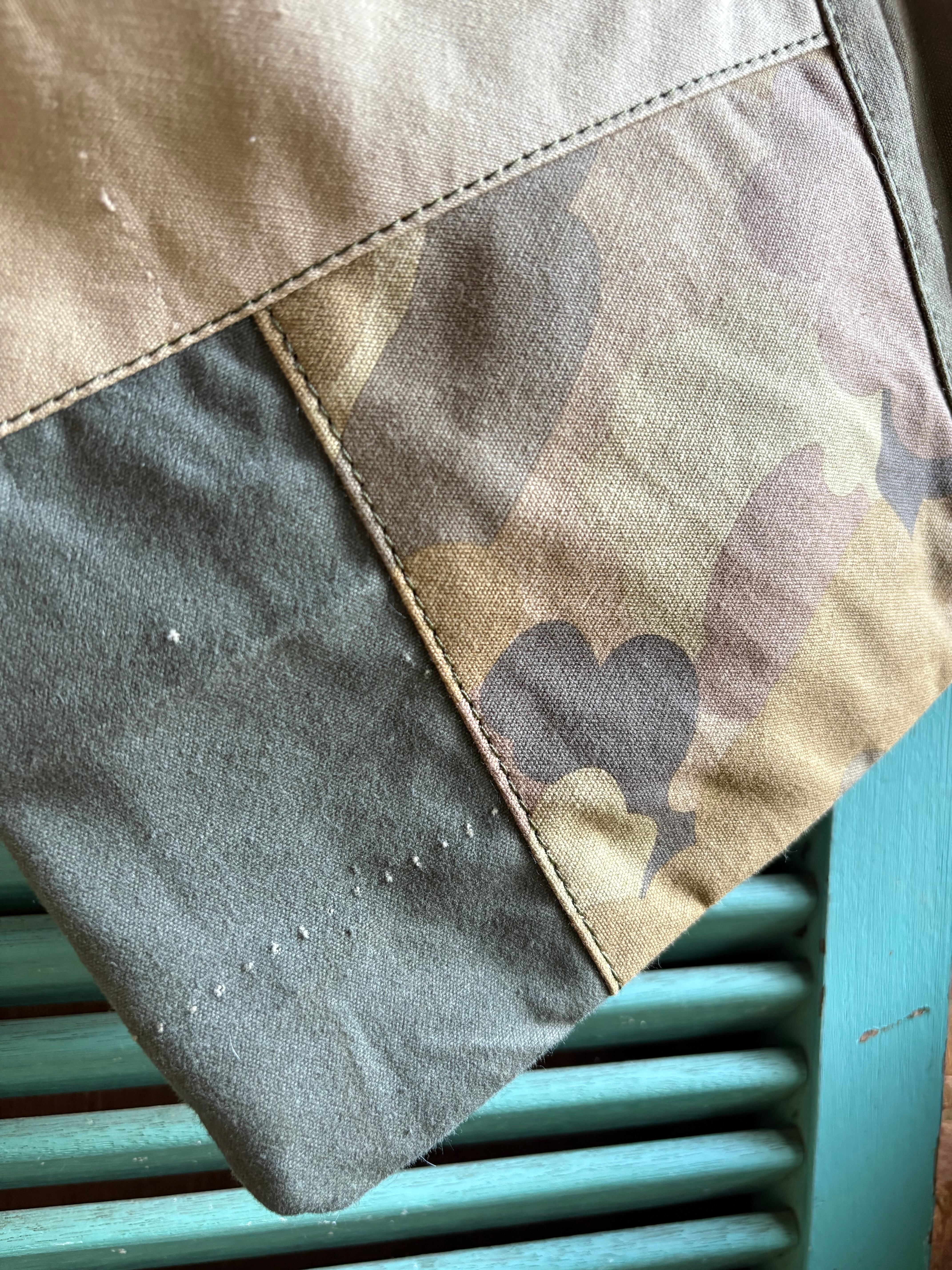 ミリタリーテントのディテールを生かしたオンリーワンのデザインとなっており、ボタンホールやハトメ、テントの耳をそのままに使っている為、ほつれや破れが入る場合があります。