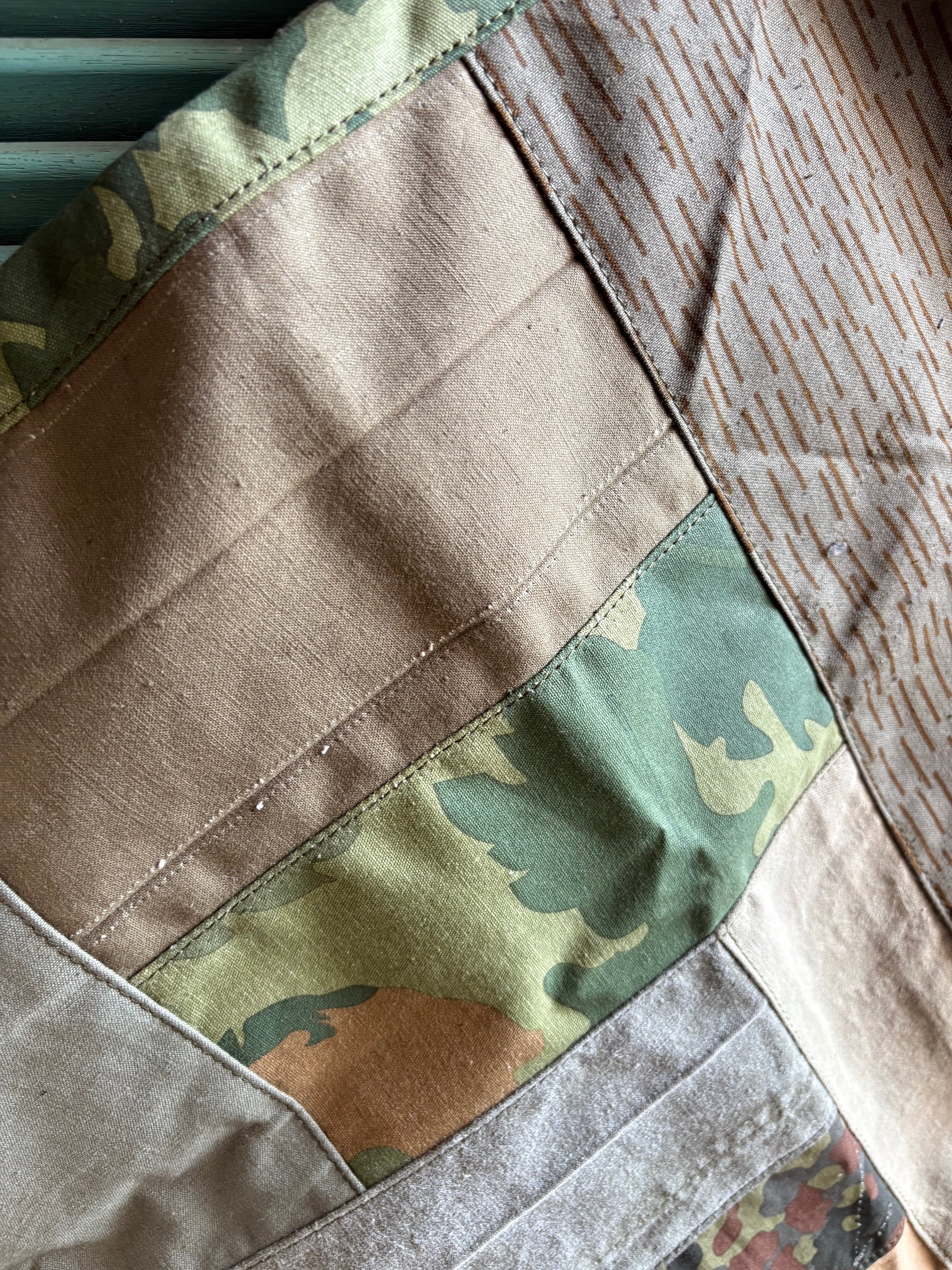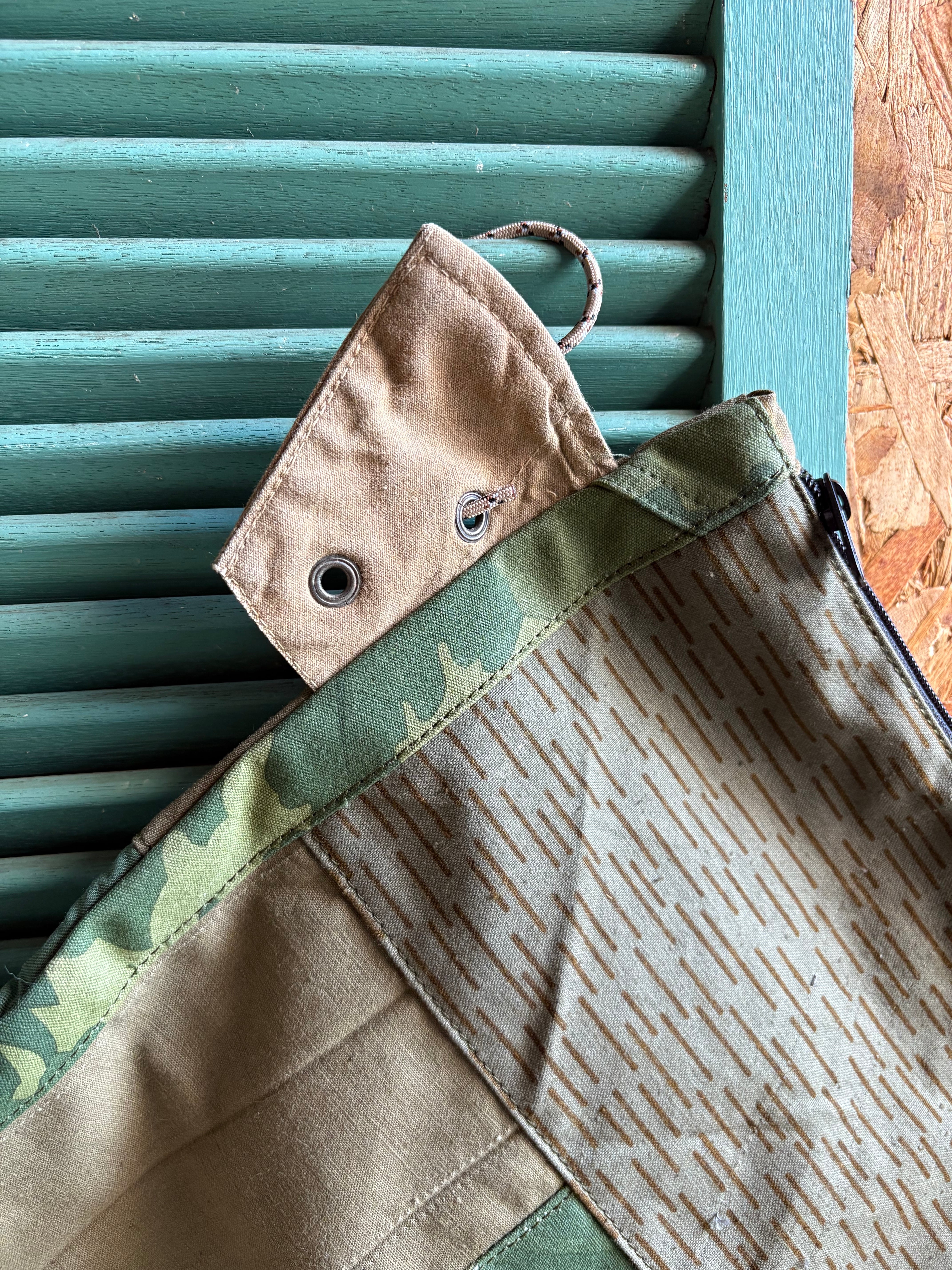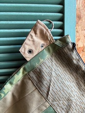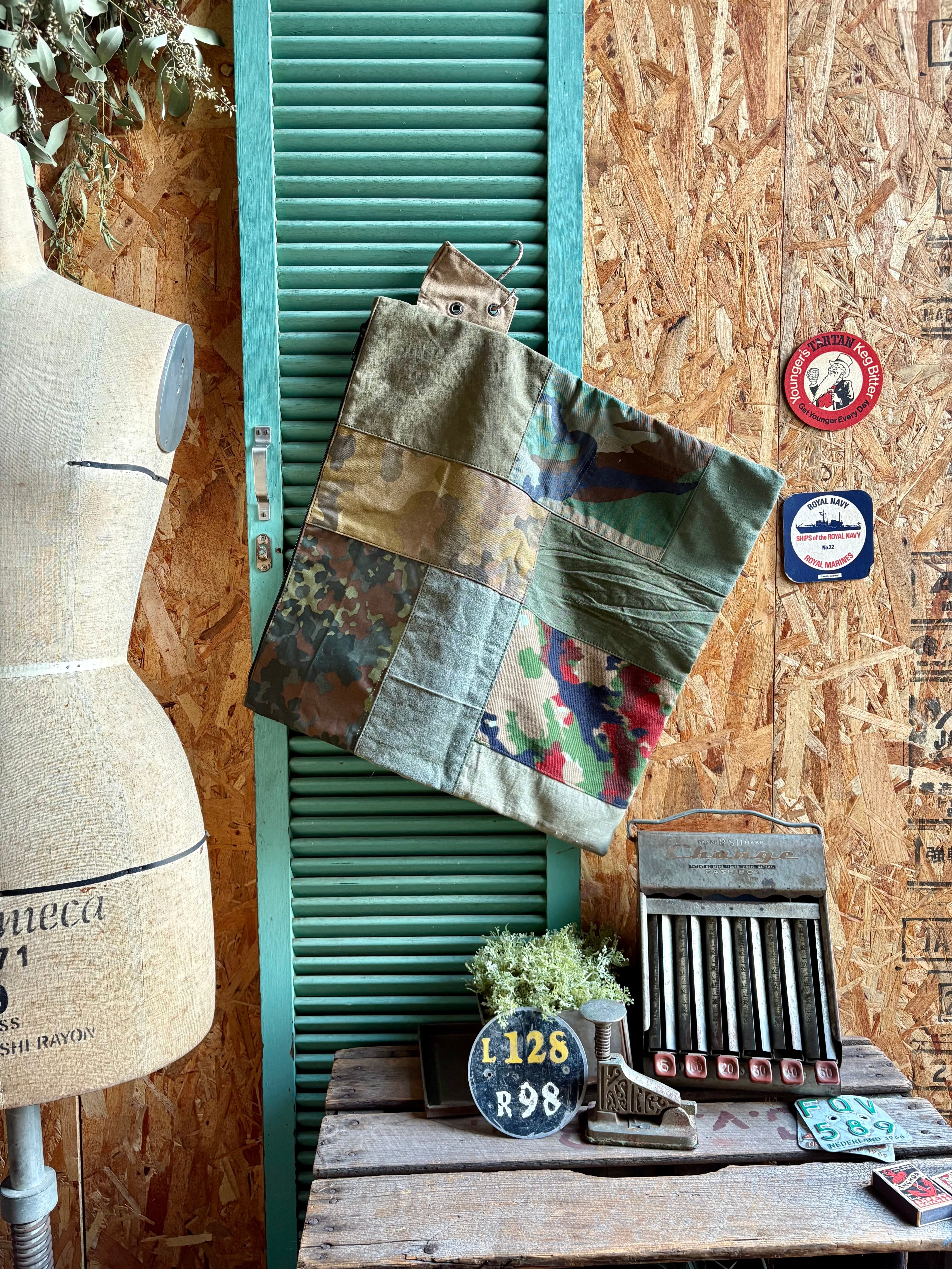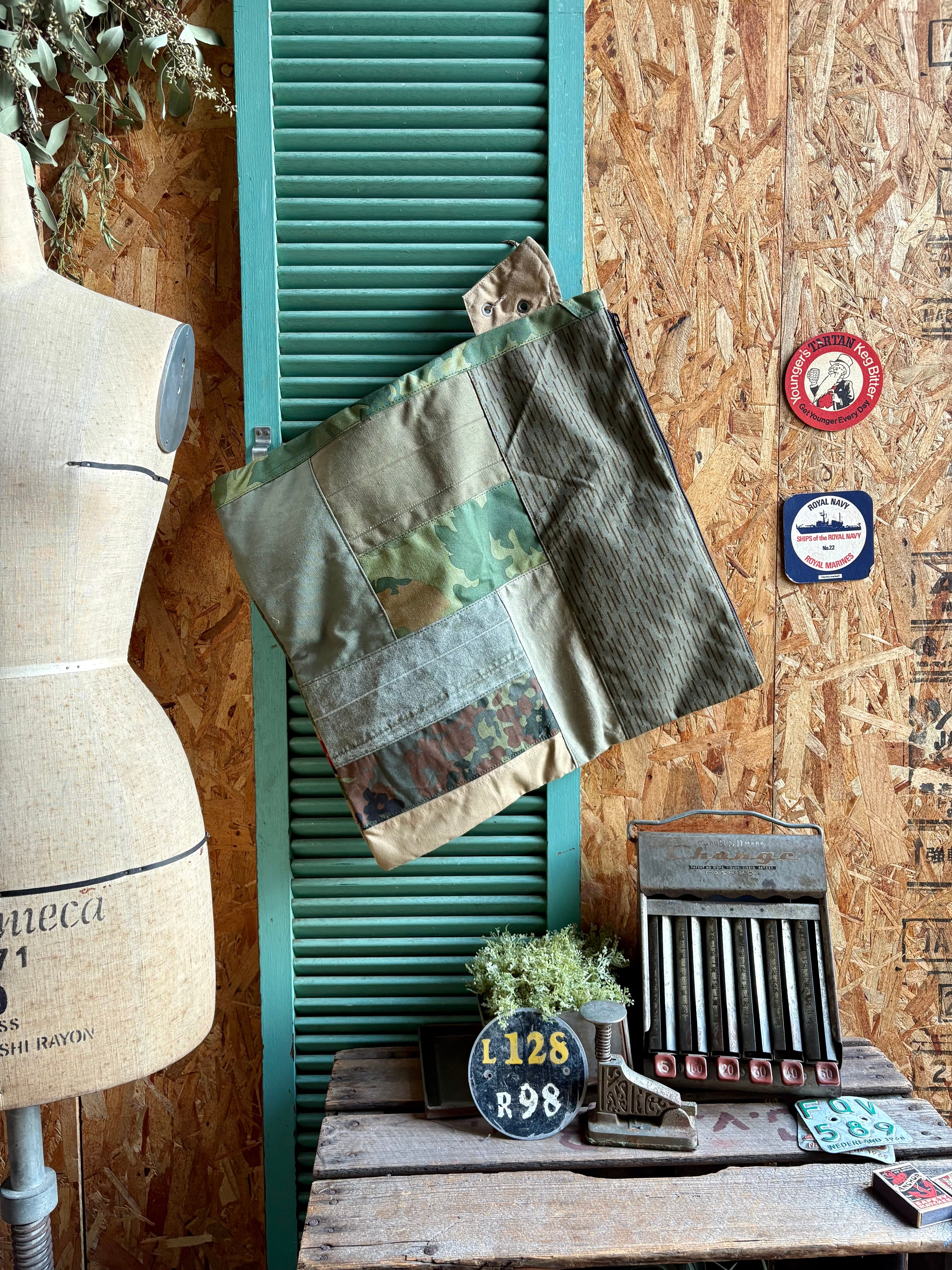 ミリタリーテントのディテールを生かしたオンリーワンのデザインとなっており、ボタンホールやハトメ、テントの耳をそのままに使っている為、ほつれや破れが入る場合があります。