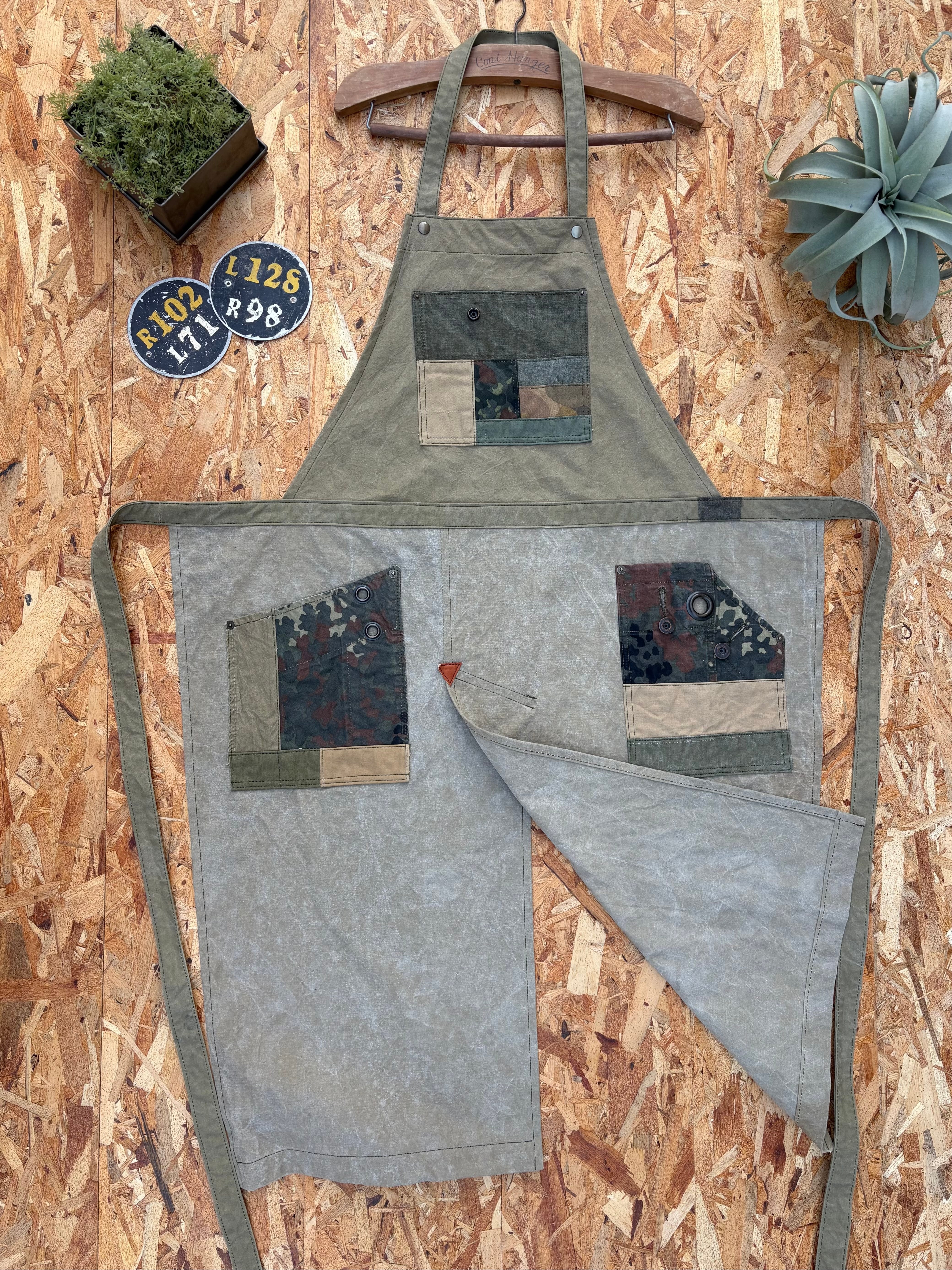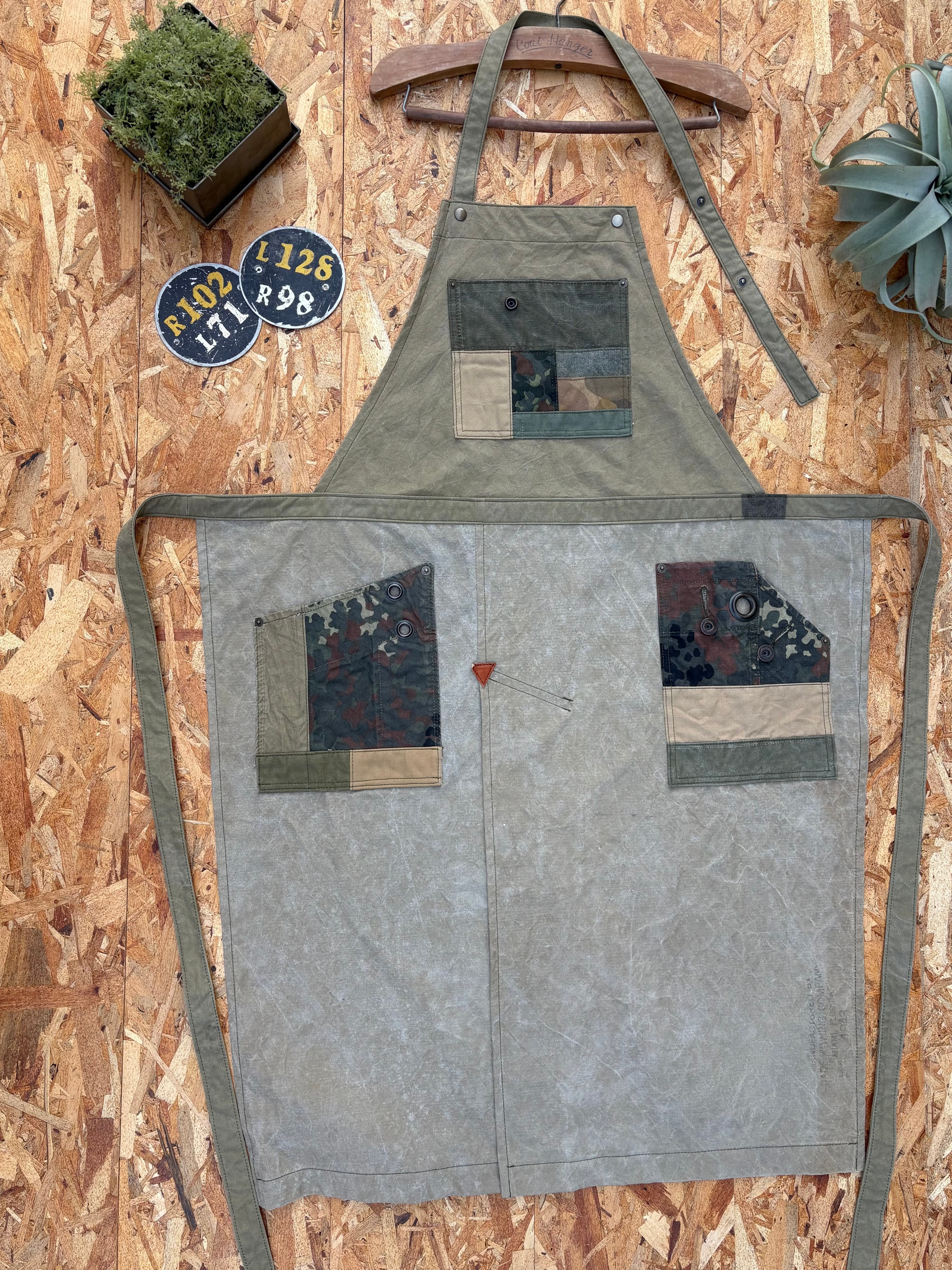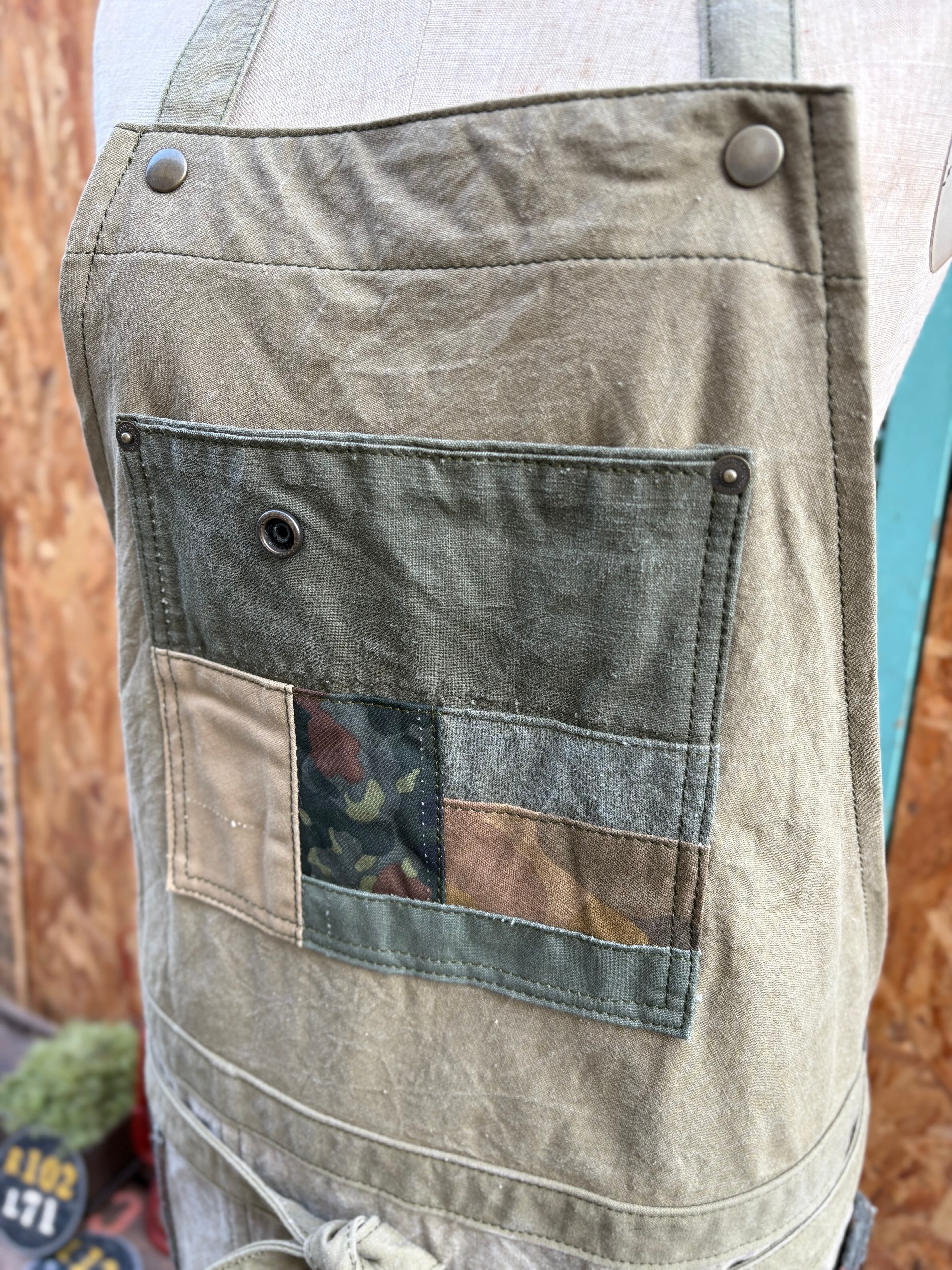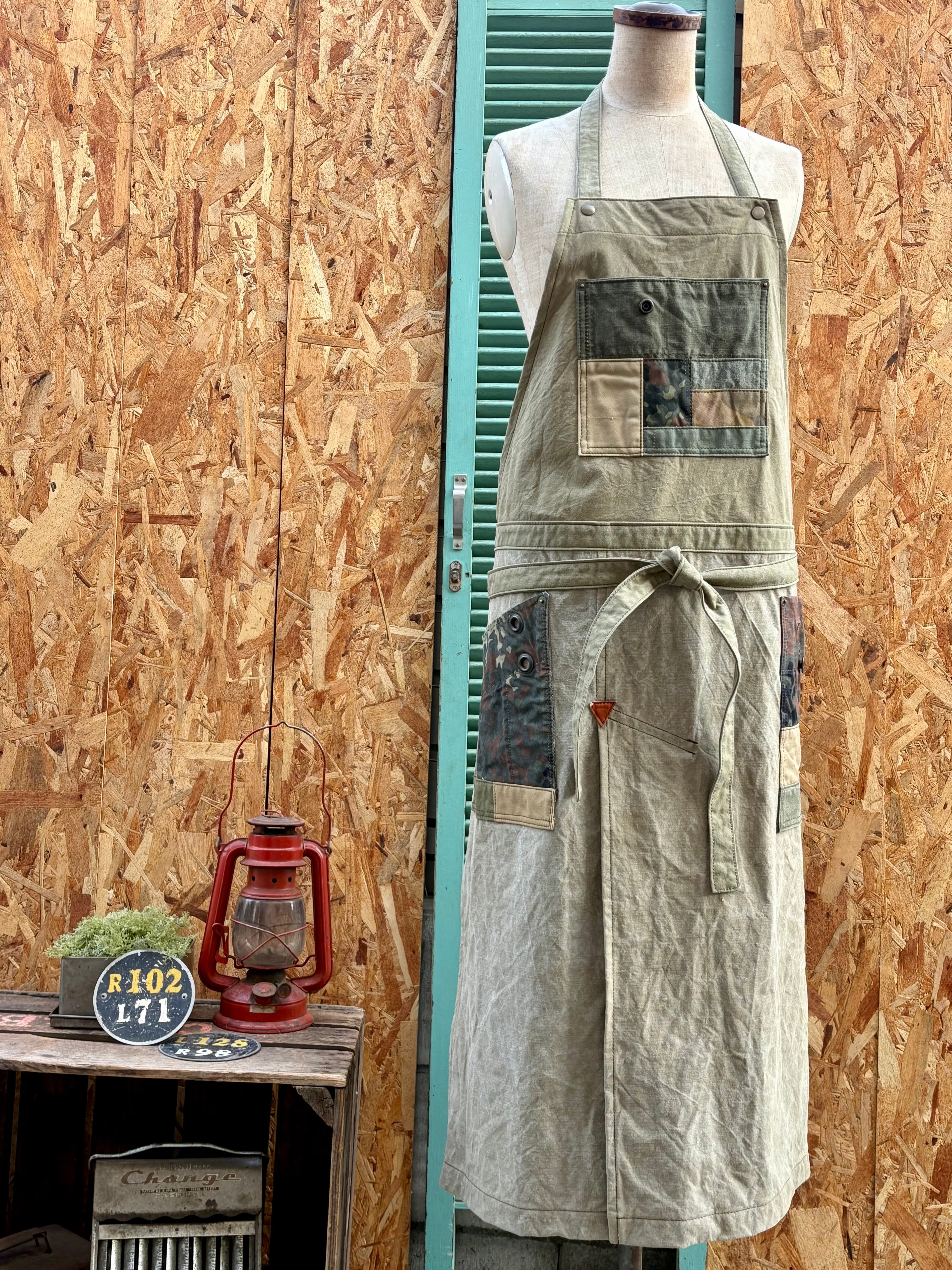 ユーズドミリタリーテントをリメイクしたワークエプロンです。ミリタリーテントのディテールを生かしたオンリーワンのデザインとなっており、ボタンホールやハトメ、テントの耳をそのままに使っている為、ほつれや破れが入る場合があります。