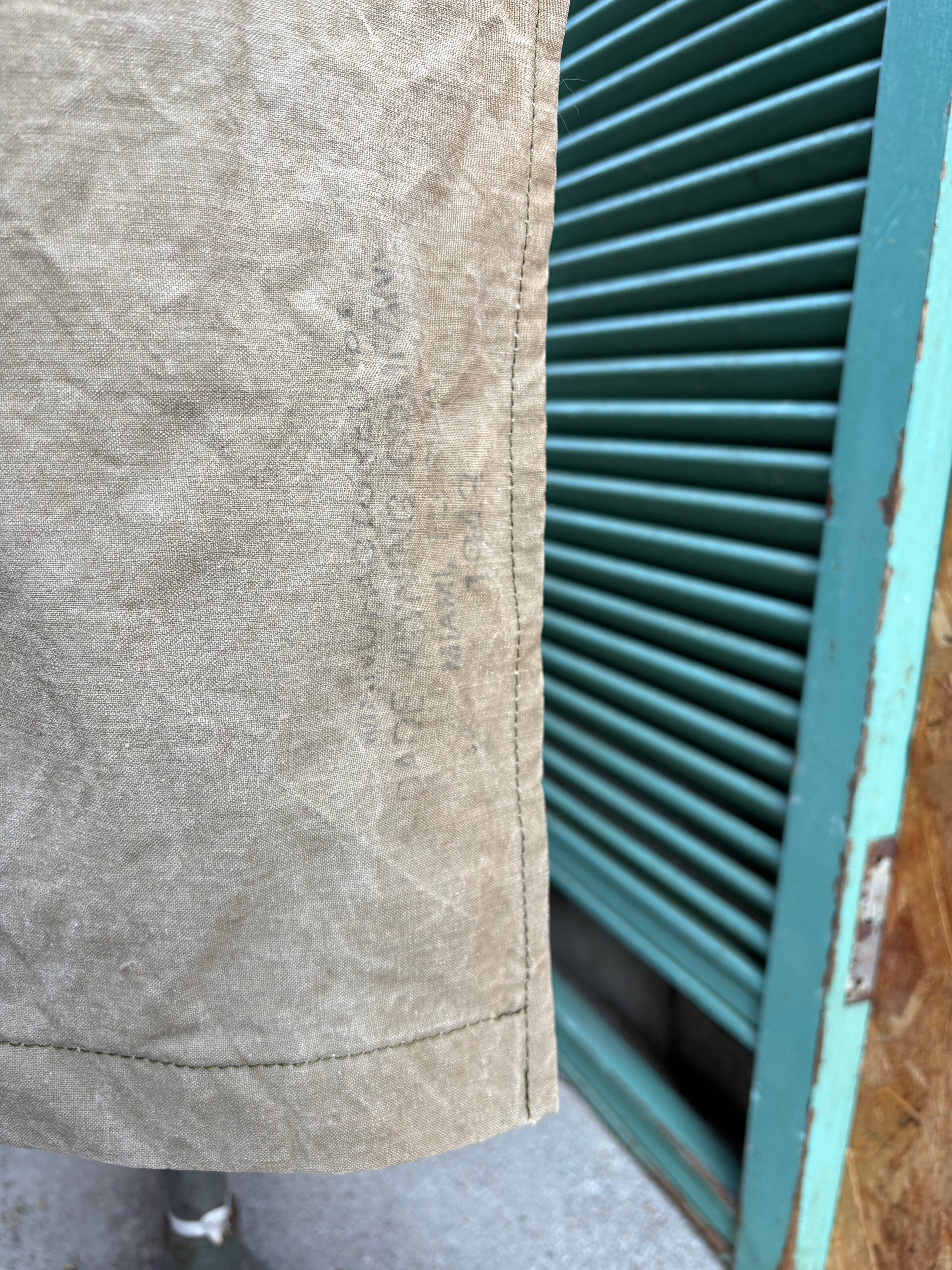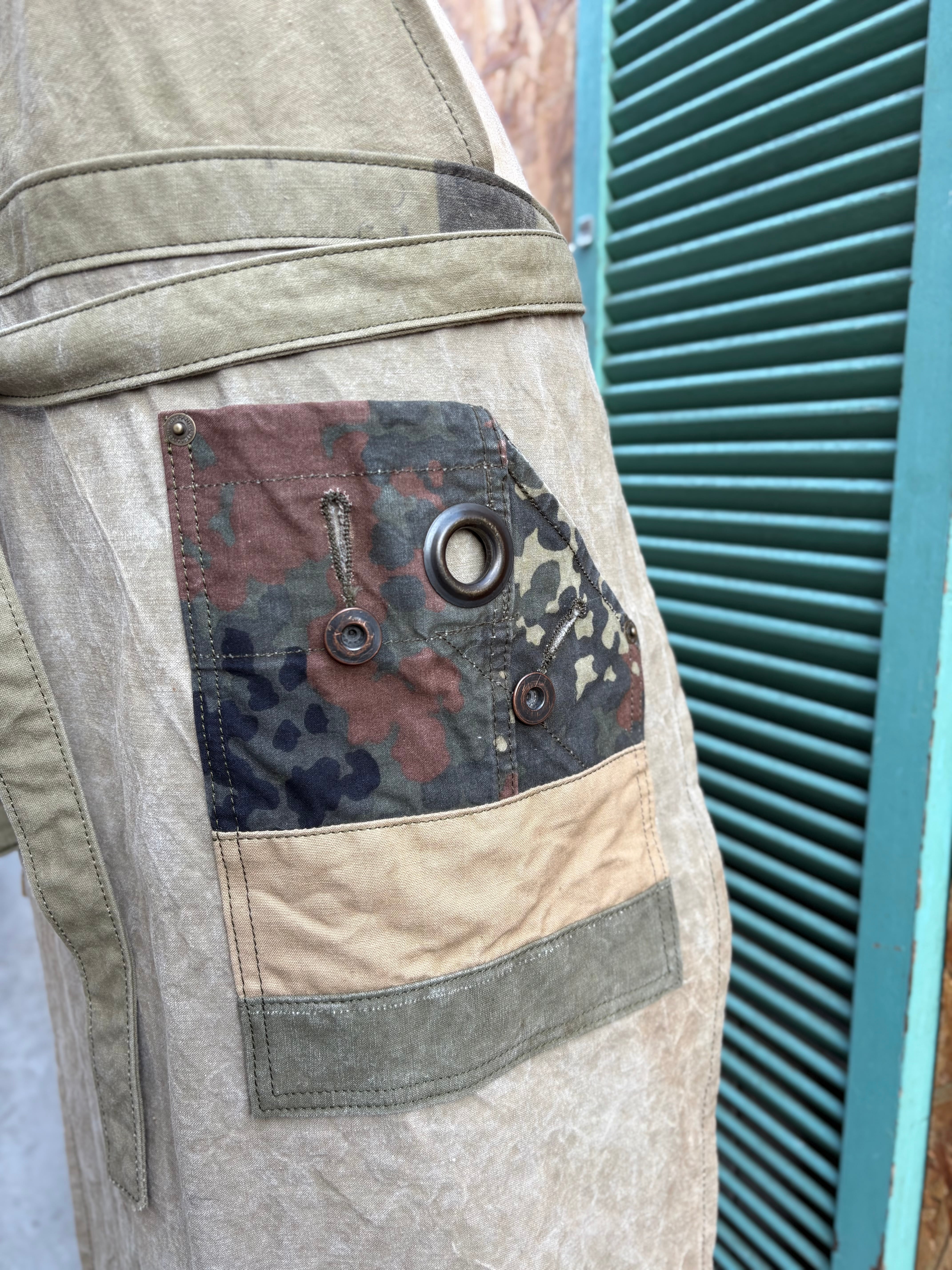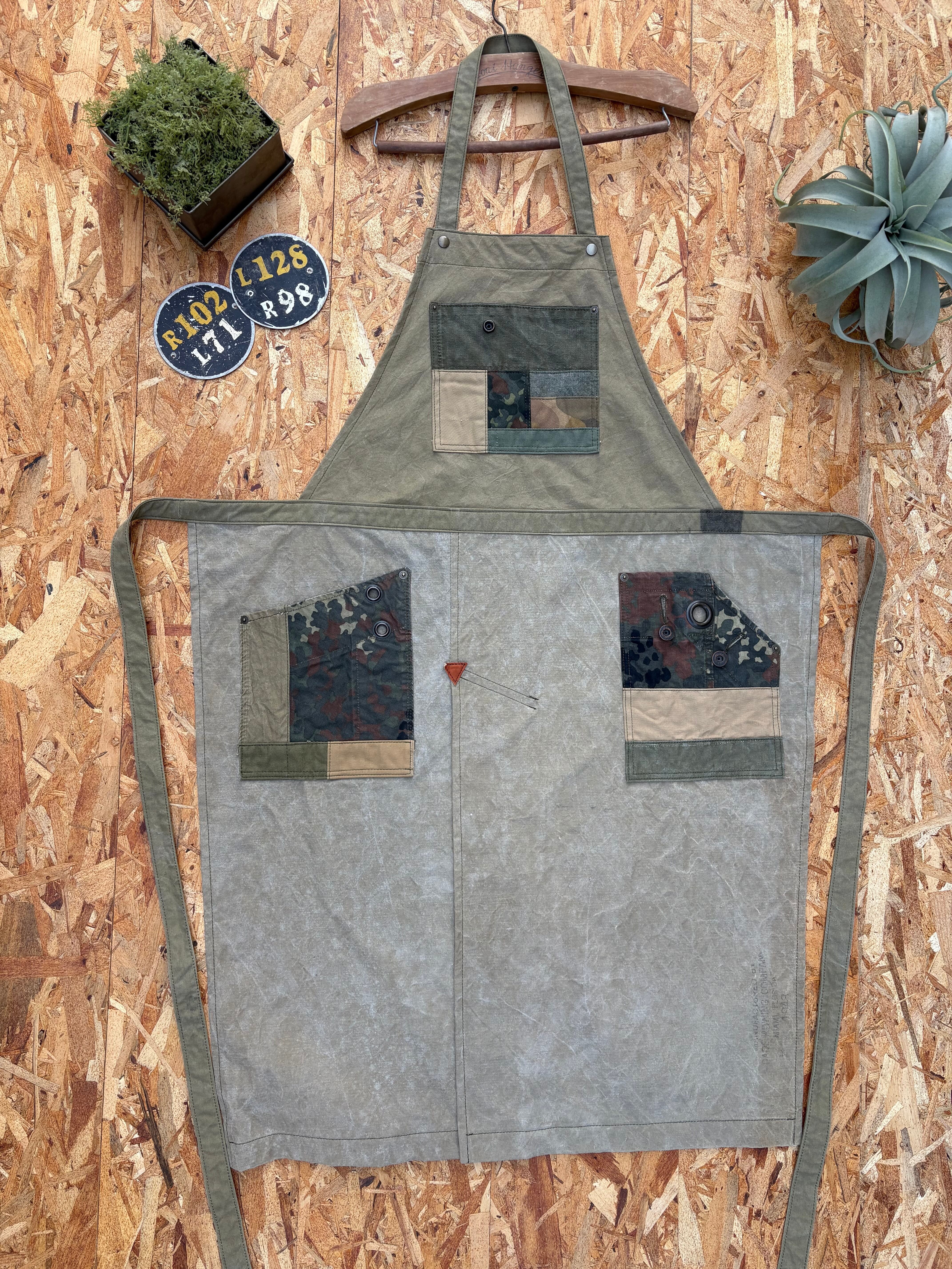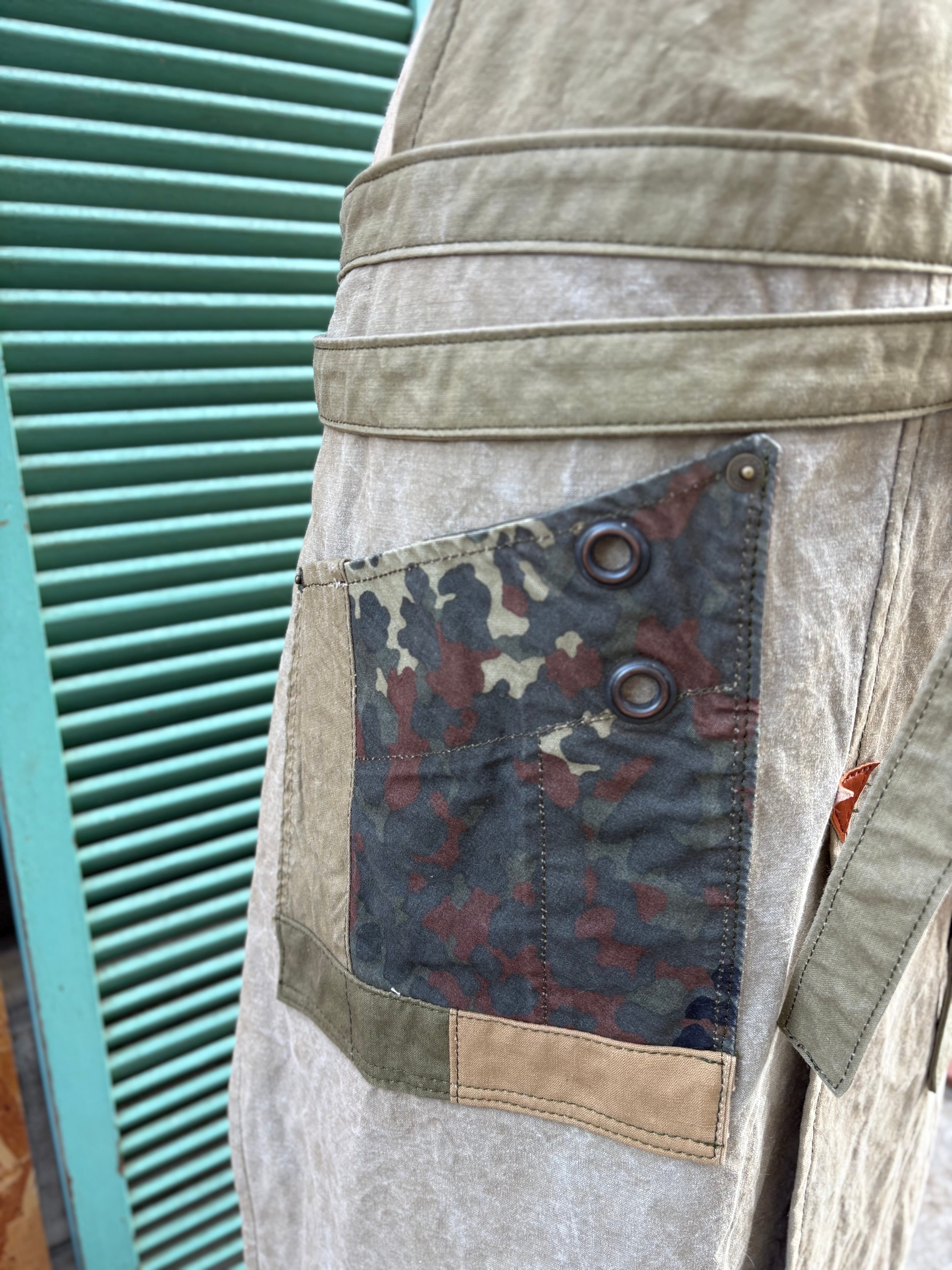 ユーズドミリタリーテントをリメイクしたワークエプロンです。ミリタリーテントのディテールを生かしたオンリーワンのデザインとなっており、ボタンホールやハトメ、テントの耳をそのままに使っている為、ほつれや破れが入る場合があります。