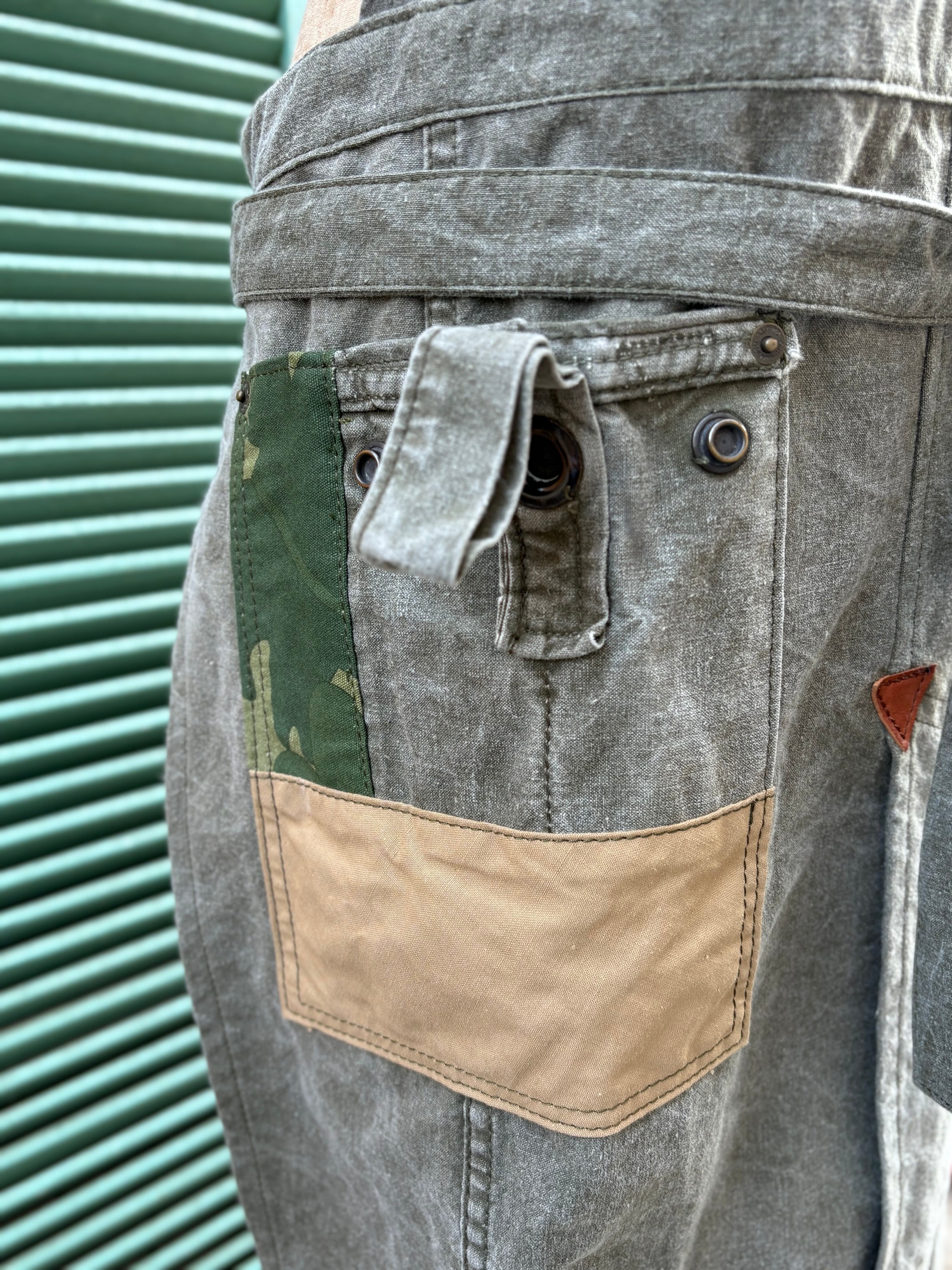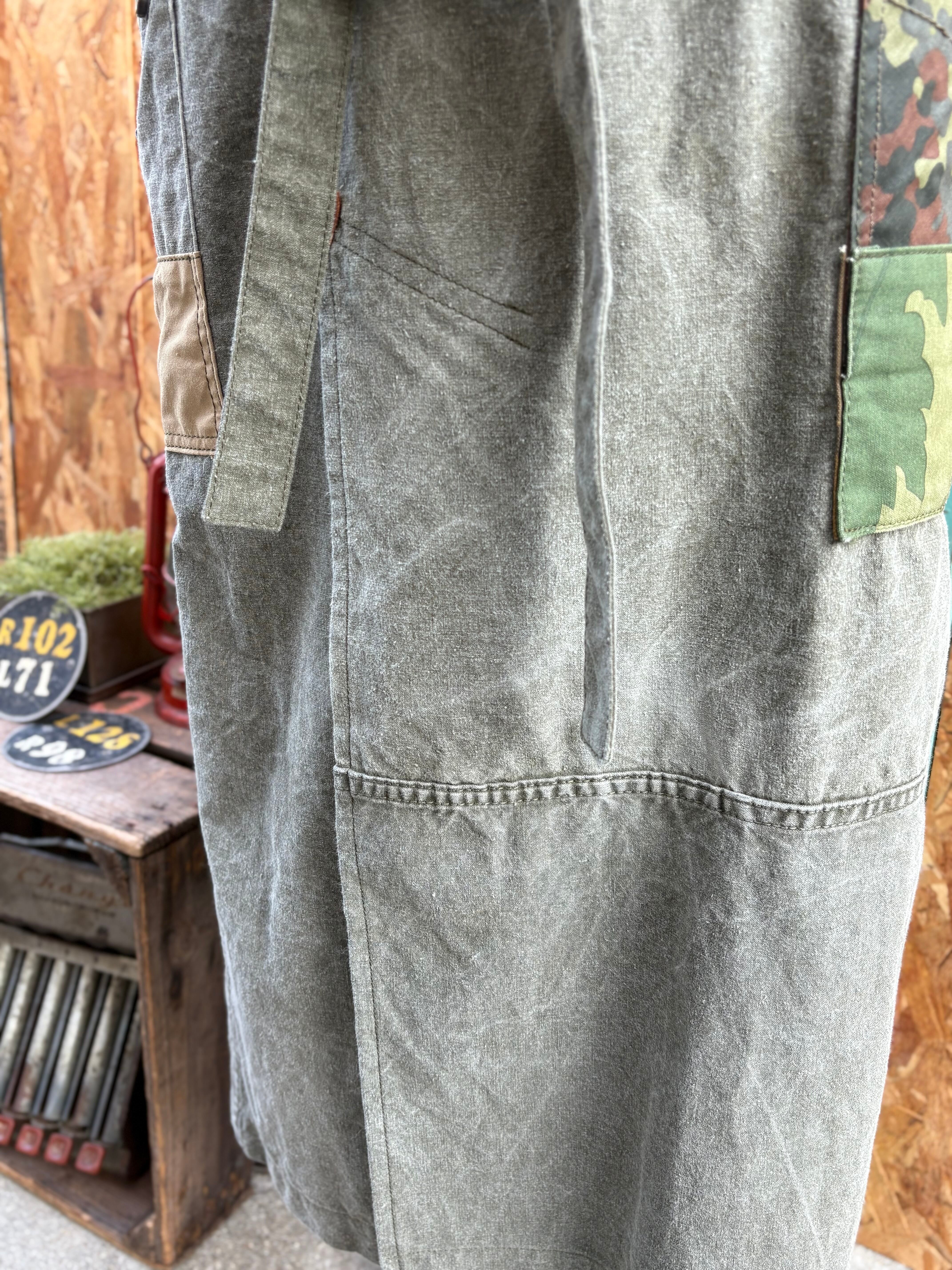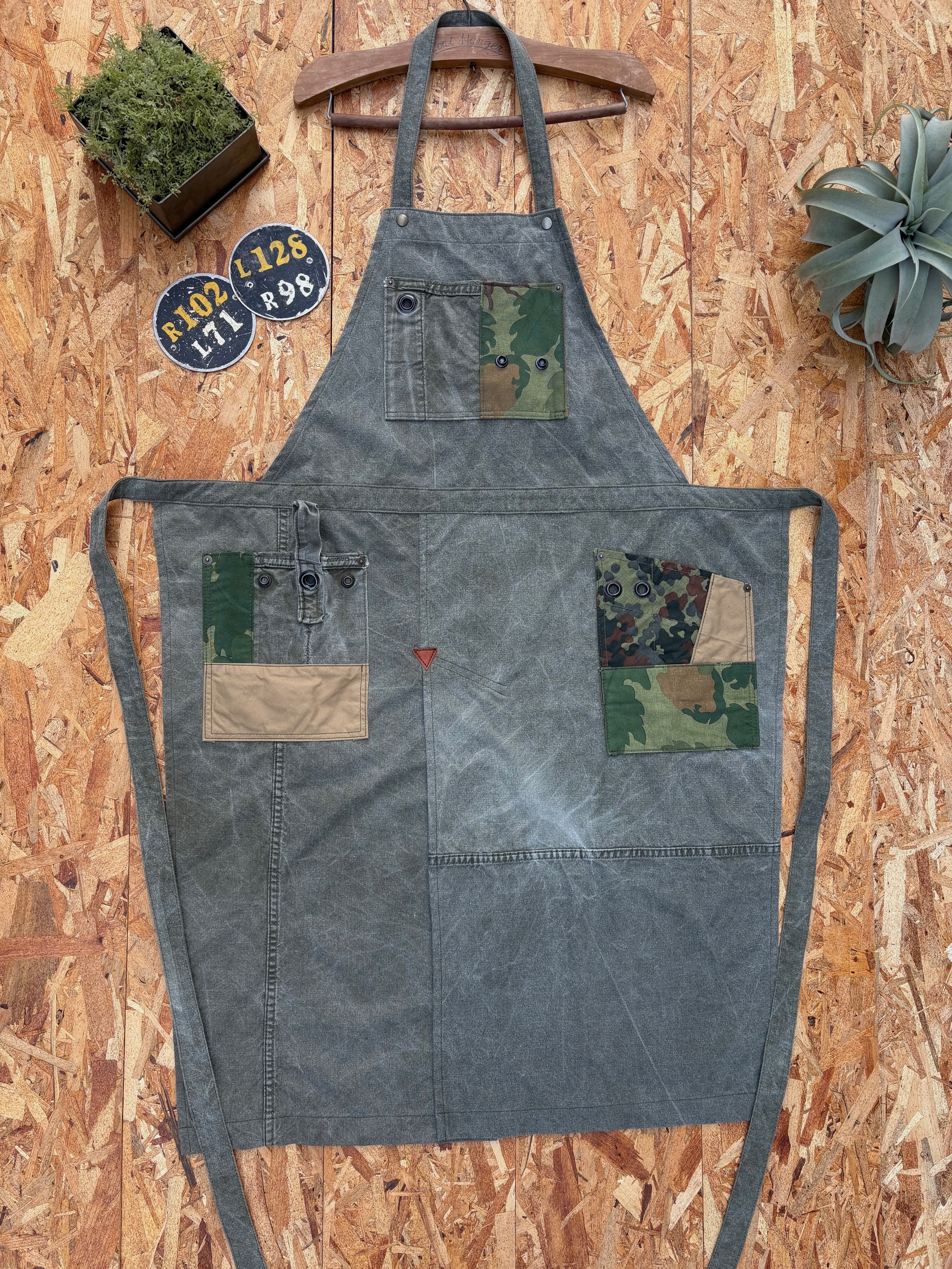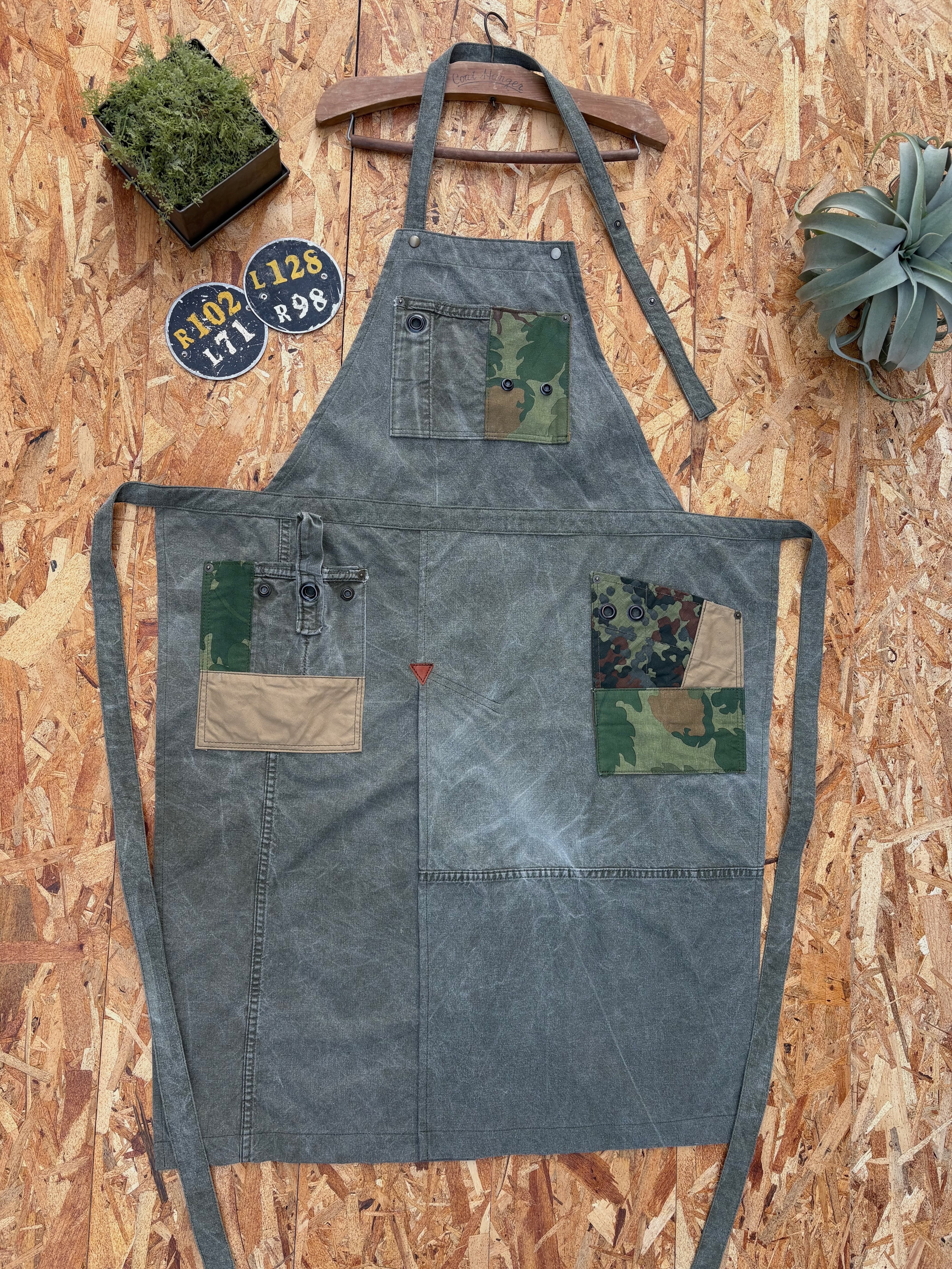 ユーズドミリタリーテントをリメイクしたワークエプロンです。ミリタリーテントのディテールを生かしたオンリーワンのデザインとなっており、ボタンホールやハトメ、テントの耳をそのままに使っている為、ほつれや破れが入る場合があります。