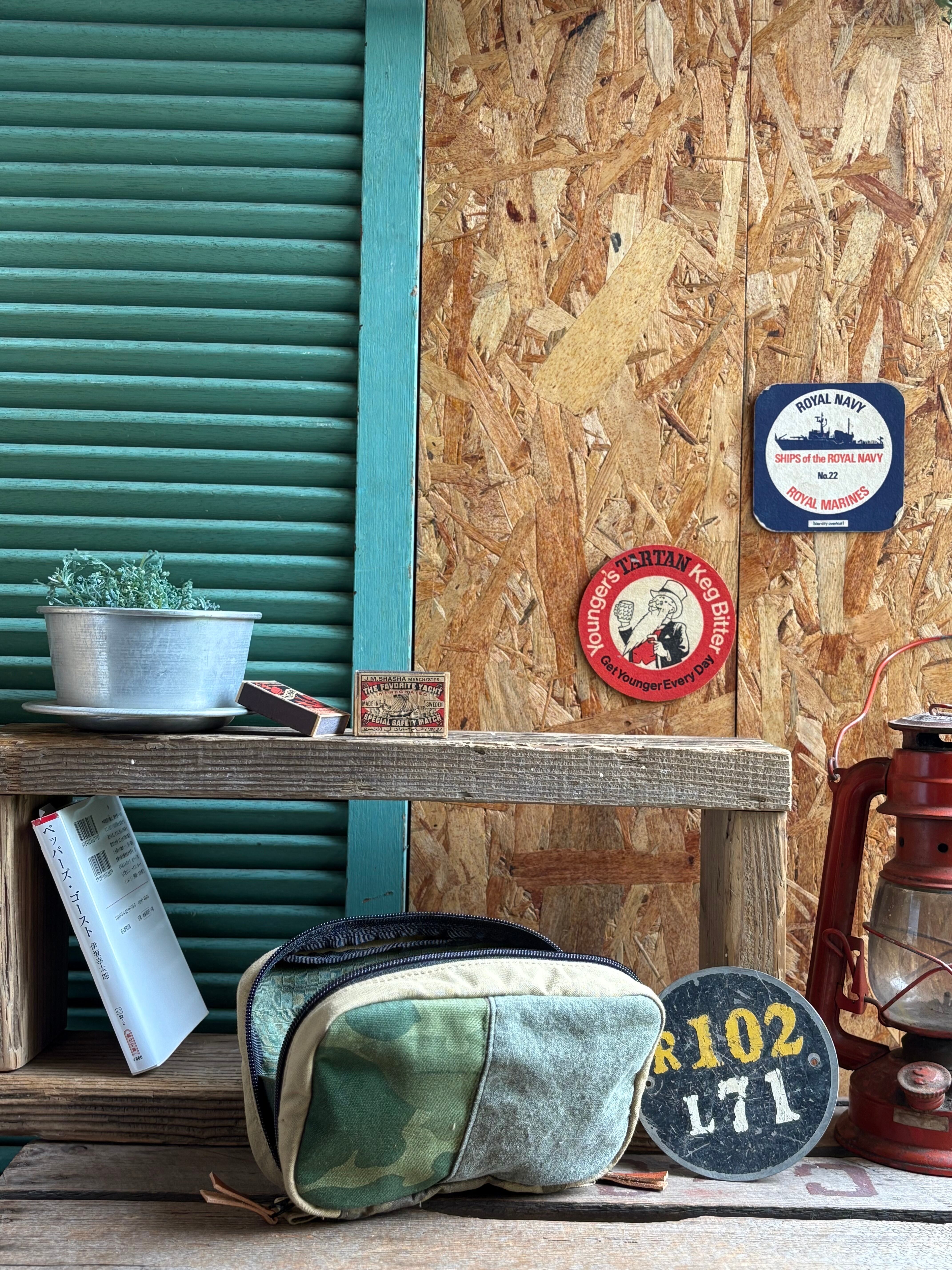 ミリタリーテントのディテールを生かしたオンリーワンのデザインとなっており、ボタンホールやハトメ、テントの耳をそのままに使っている為、ほつれや破れが入る場合があります。