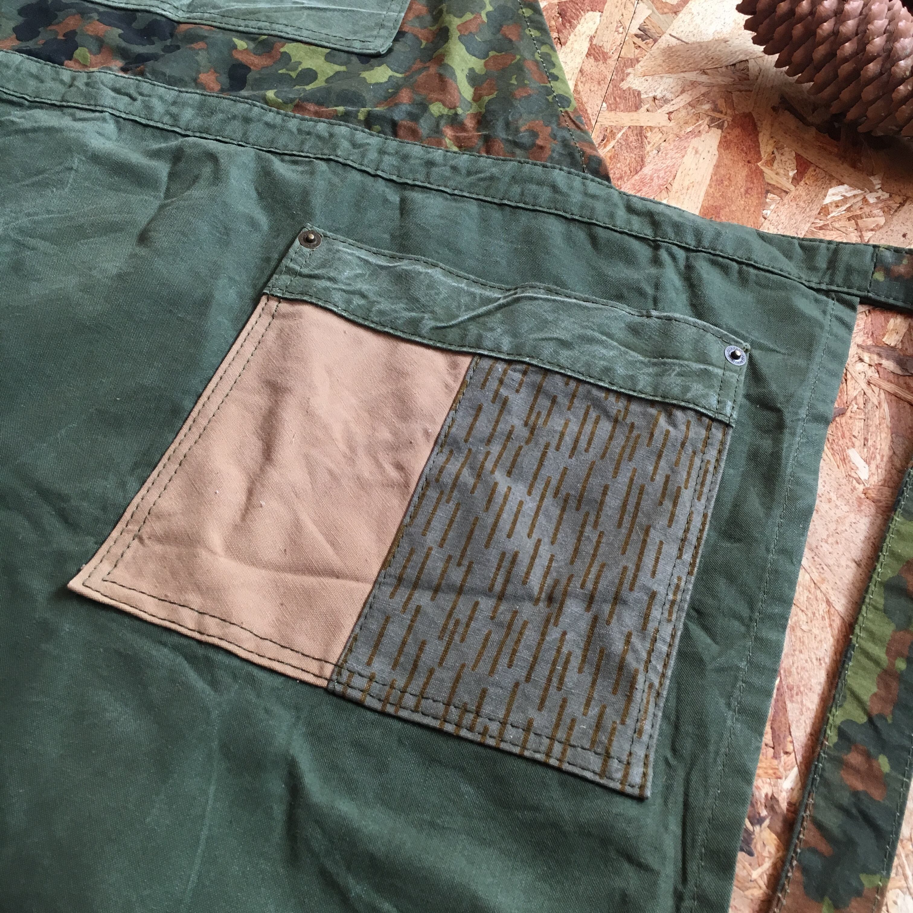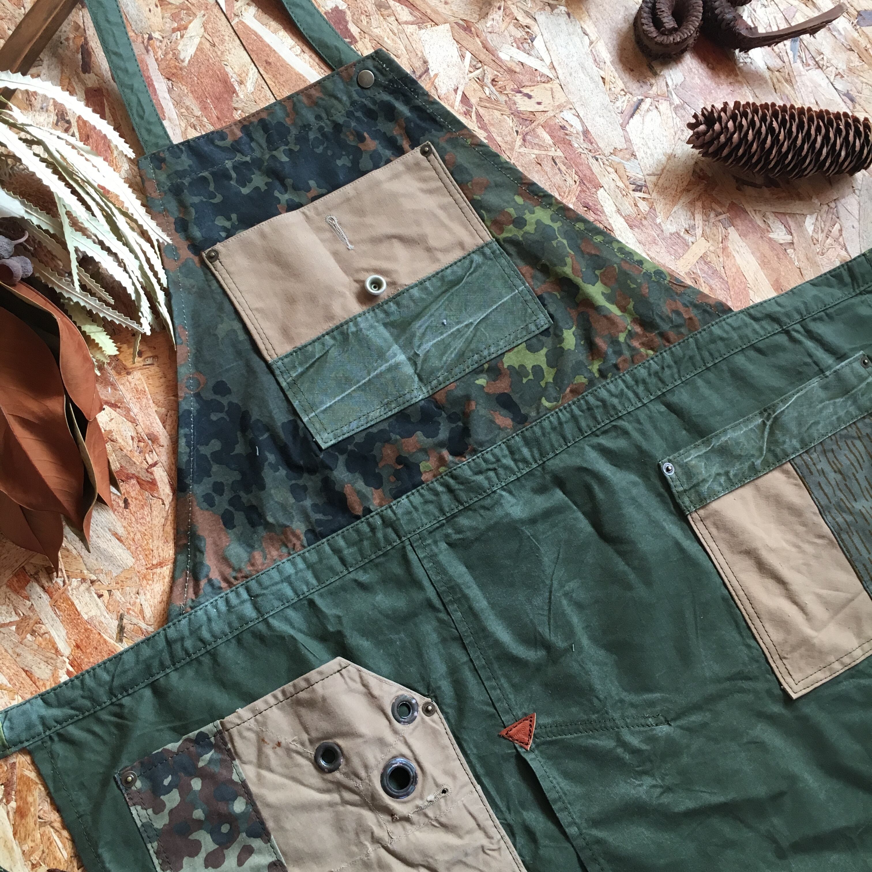 ユーズドミリタリーテントをリメイクしたワークエプロンです。ミリタリーテントのディテールを生かしたオンリーワンのデザインとなっており、ボタンホールやハトメ、テントの耳をそのままに使っている為、ほつれや破れが入る場合があります。